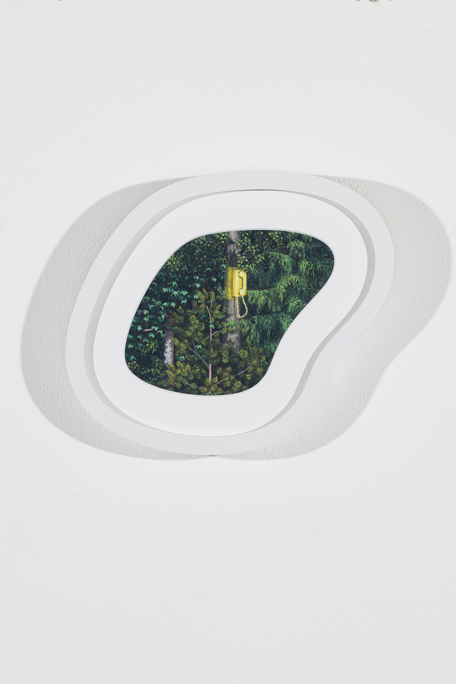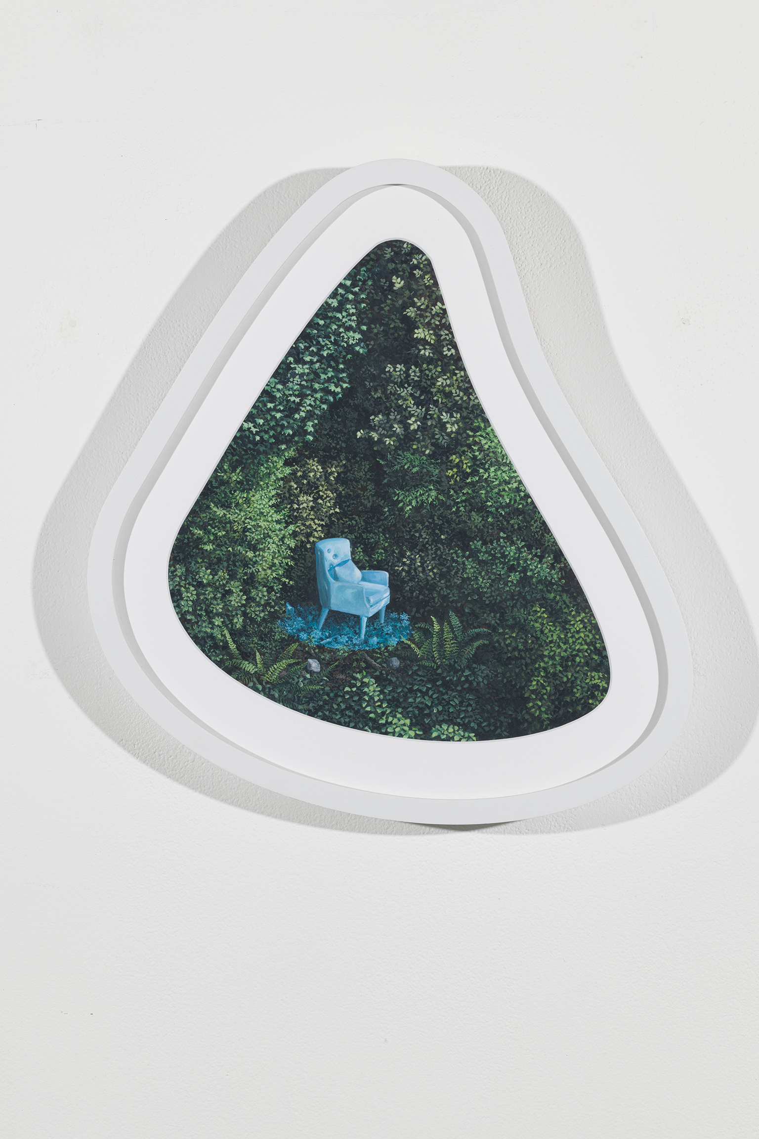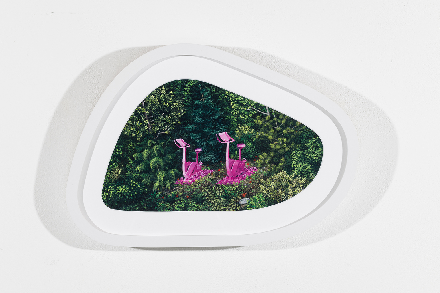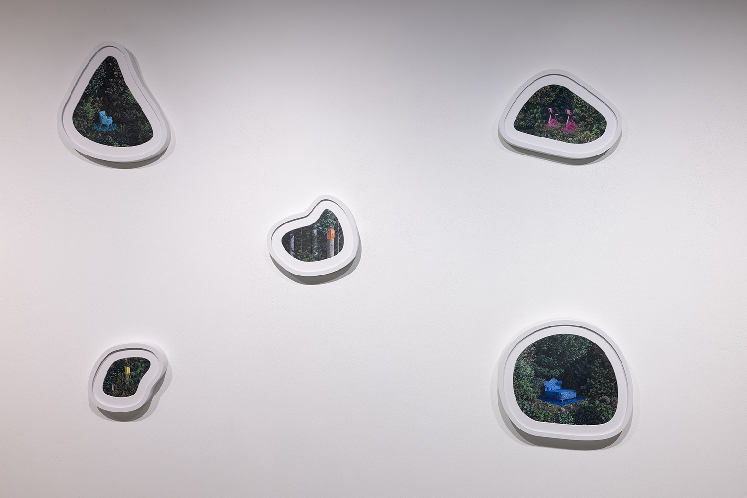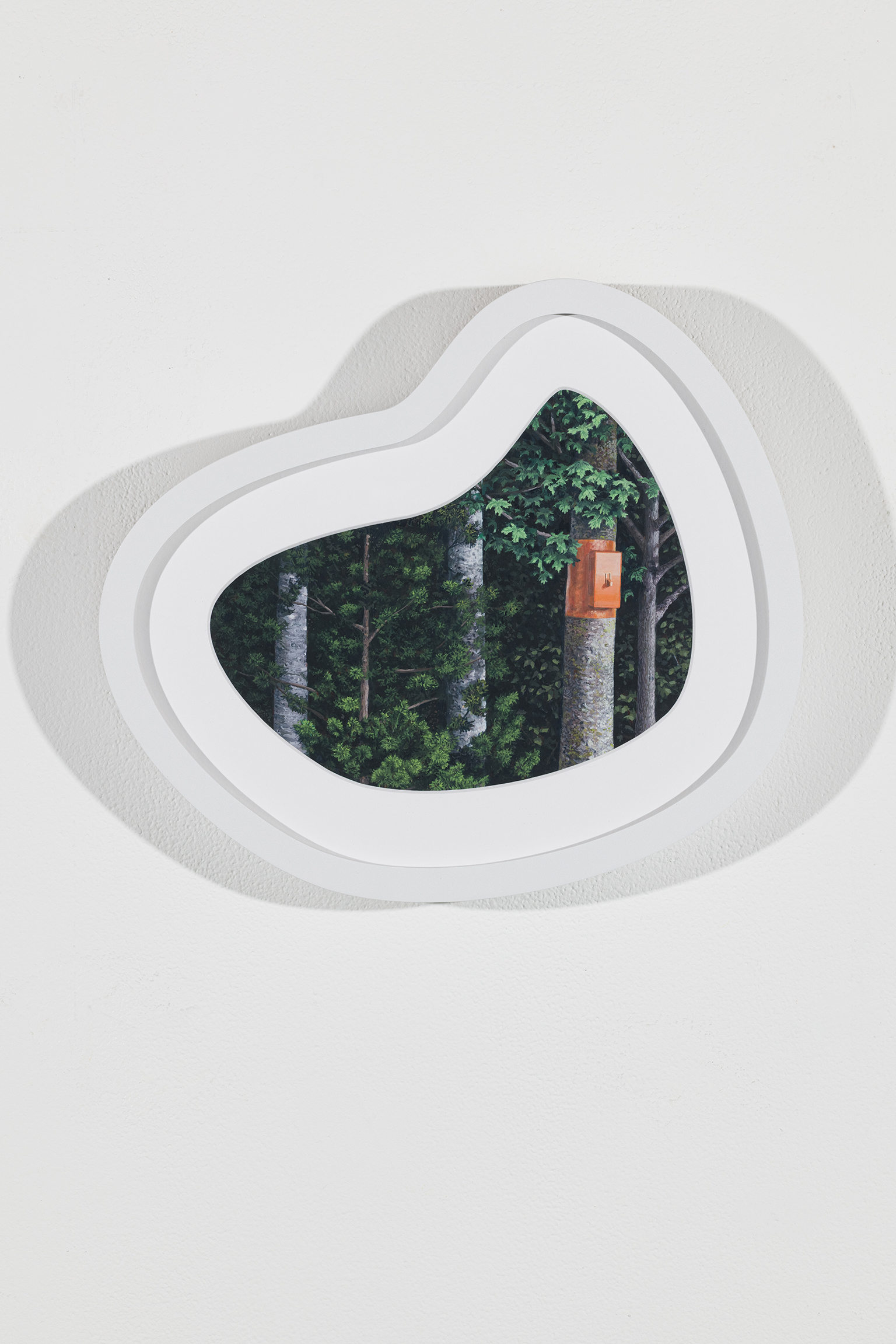 L’ambiguïté que cultive Jazz Keillor entre nature et civilisation se trouve reflétée dans le titre de son exposition : ces images forestières minutieusement dépeintes sont-elles de véritables paysages (« landscape ») ou des mises en scène paysagères (« landscaped ») qui cherchent à faire vrai, parfois juste du bout des lèvres? Car non seulement on retrouve dans ces boisés touffus des objets absurdes tels que des prises électriques et des vélos d’entraînement, mais ceux-ci se parent de couleurs criardes qui mettent en relief leur incongruité. Même les éléments naturels se métamorphosent, comme infectés par le virus de la ville, de la culture, de la technologie : le daim et le lapin prennent des teintes bleu poudre morbides, le tronc du bouleau se plie à l’instar d’un arc roman ou d’un spaghetti, le bosquet devient un nuage qui flotte étrangement au-dessus du sol comme quelque vaisseau-mère extraterrestre.