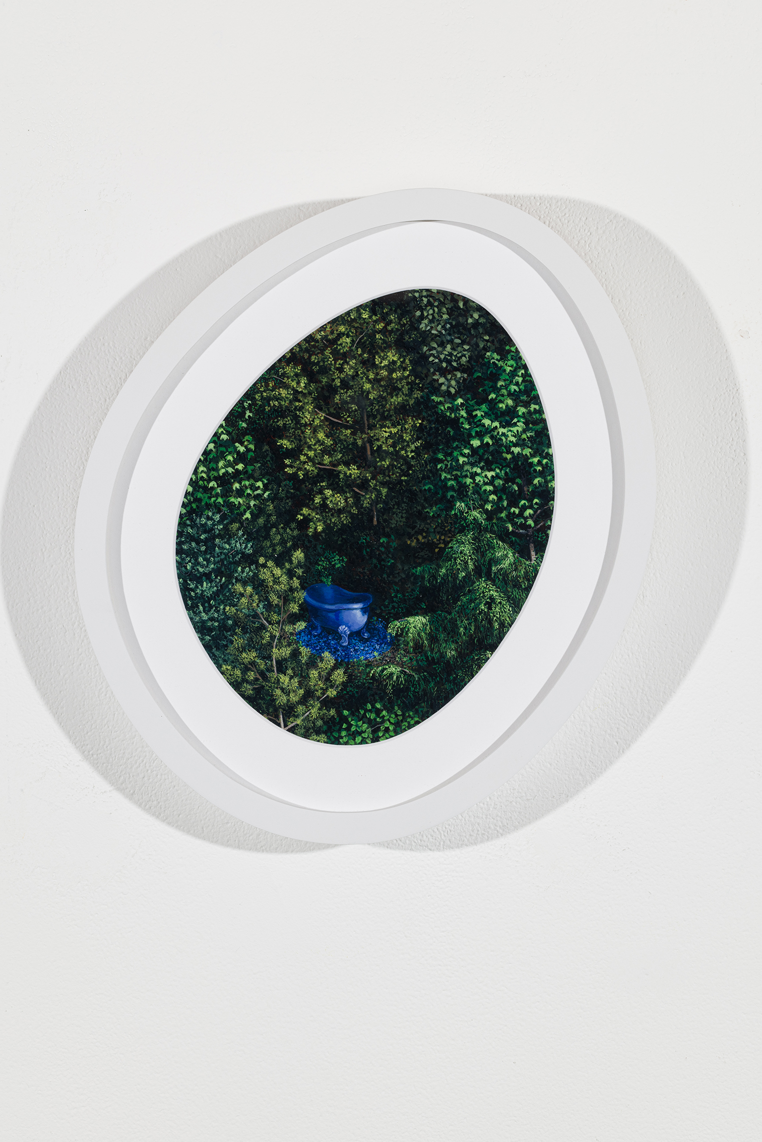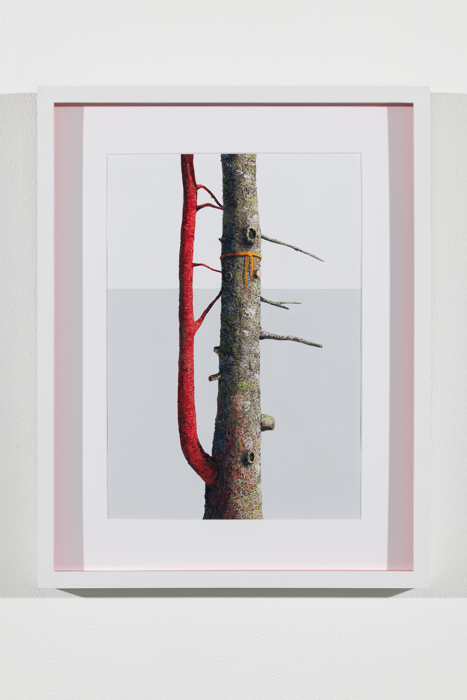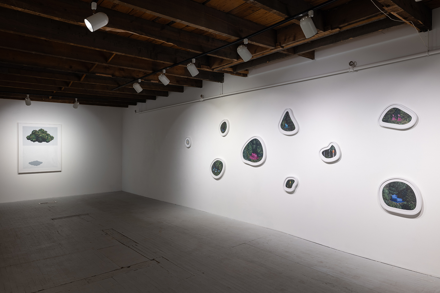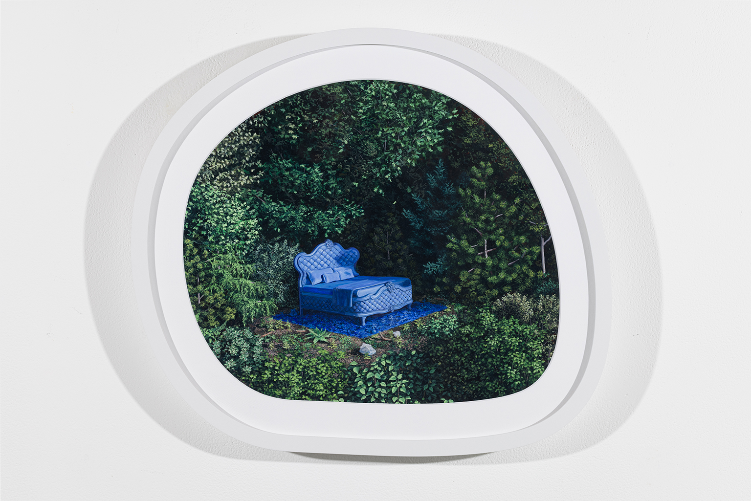 L’ambiguïté que cultive Jazz Keillor entre nature et civilisation se trouve reflétée dans le titre de son exposition : ces images forestières minutieusement dépeintes sont-elles de véritables paysages (« landscape ») ou des mises en scène paysagères (« landscaped ») qui cherchent à faire vrai, parfois juste du bout des lèvres? Car non seulement on retrouve dans ces boisés touffus des objets absurdes tels que des prises électriques et des vélos d’entraînement, mais ceux-ci se parent de couleurs criardes qui mettent en relief leur incongruité. Même les éléments naturels se métamorphosent, comme infectés par le virus de la ville, de la culture, de la technologie : le daim et le lapin prennent des teintes bleu poudre morbides, le tronc du bouleau se plie à l’instar d’un arc roman ou d’un spaghetti, le bosquet devient un nuage qui flotte étrangement au-dessus du sol comme quelque vaisseau-mère extraterrestre.