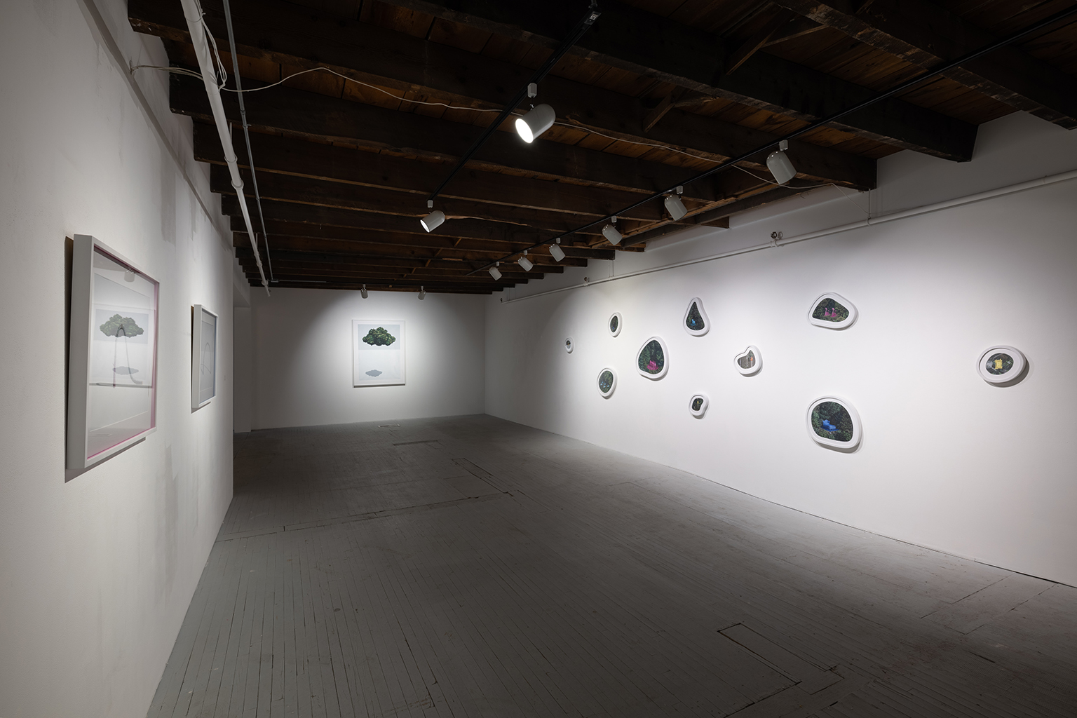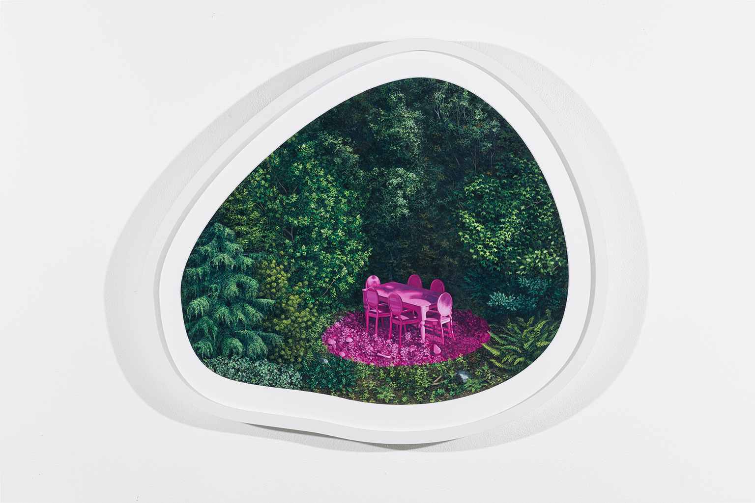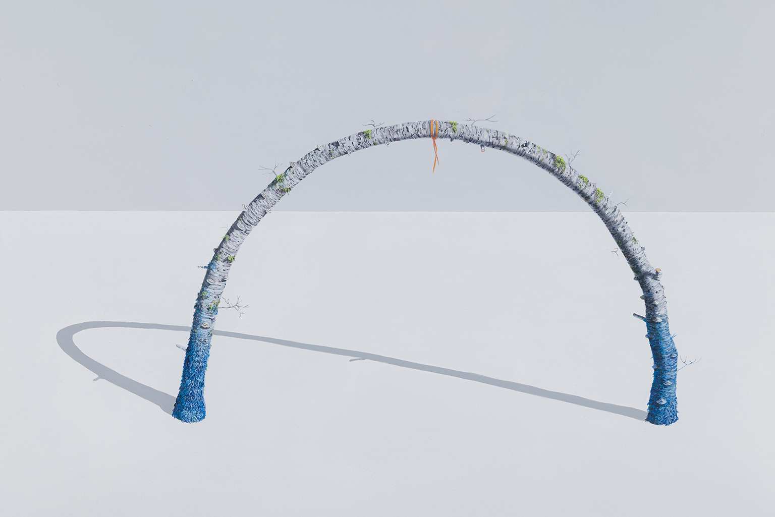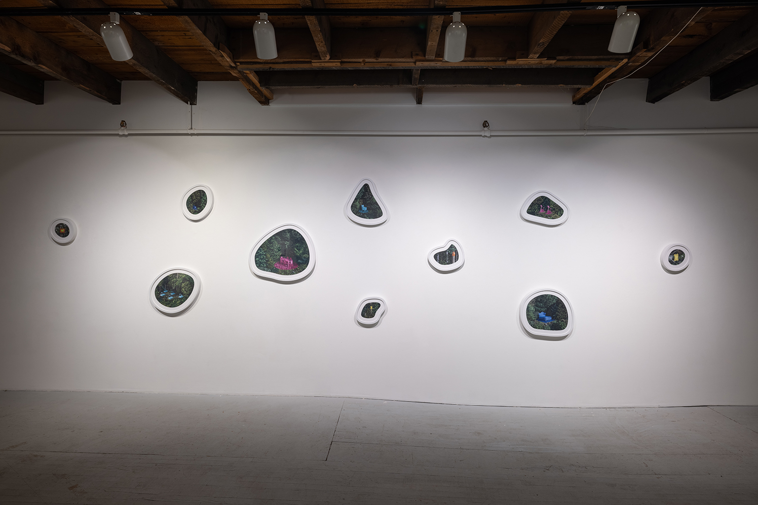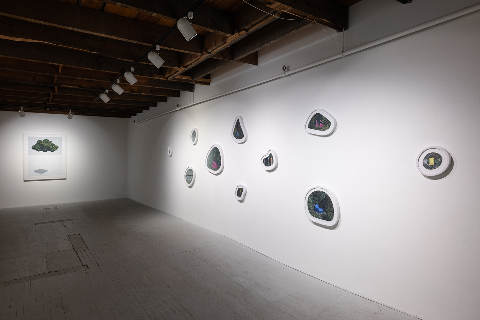 L’ambiguïté que cultive Jazz Keillor entre nature et civilisation se trouve reflétée dans le titre de son exposition : ces images forestières minutieusement dépeintes sont-elles de véritables paysages (« landscape ») ou des mises en scène paysagères (« landscaped ») qui cherchent à faire vrai, parfois juste du bout des lèvres? Car non seulement on retrouve dans ces boisés touffus des objets absurdes tels que des prises électriques et des vélos d’entraînement, mais ceux-ci se parent de couleurs criardes qui mettent en relief leur incongruité. Même les éléments naturels se métamorphosent, comme infectés par le virus de la ville, de la culture, de la technologie : le daim et le lapin prennent des teintes bleu poudre morbides, le tronc du bouleau se plie à l’instar d’un arc roman ou d’un spaghetti, le bosquet devient un nuage qui flotte étrangement au-dessus du sol comme quelque vaisseau-mère extraterrestre.