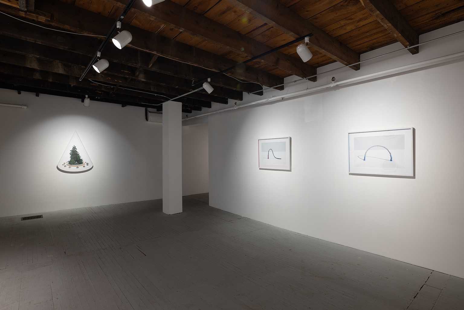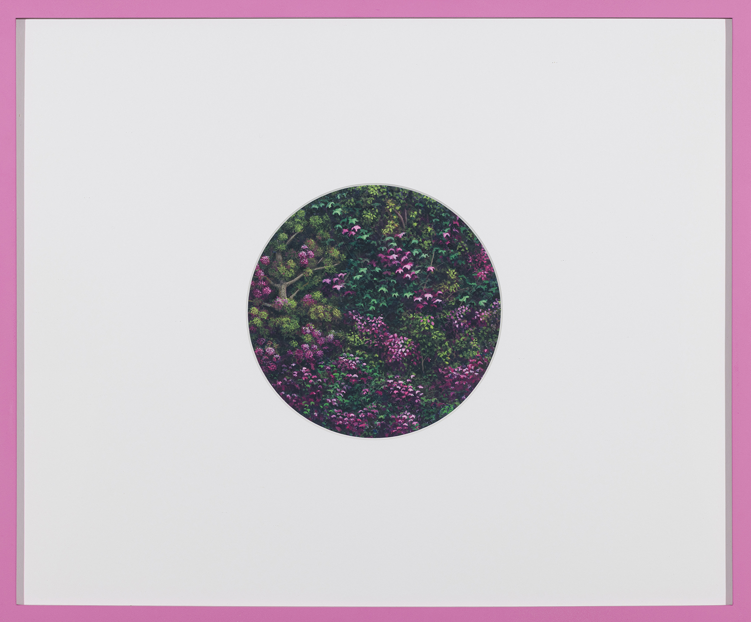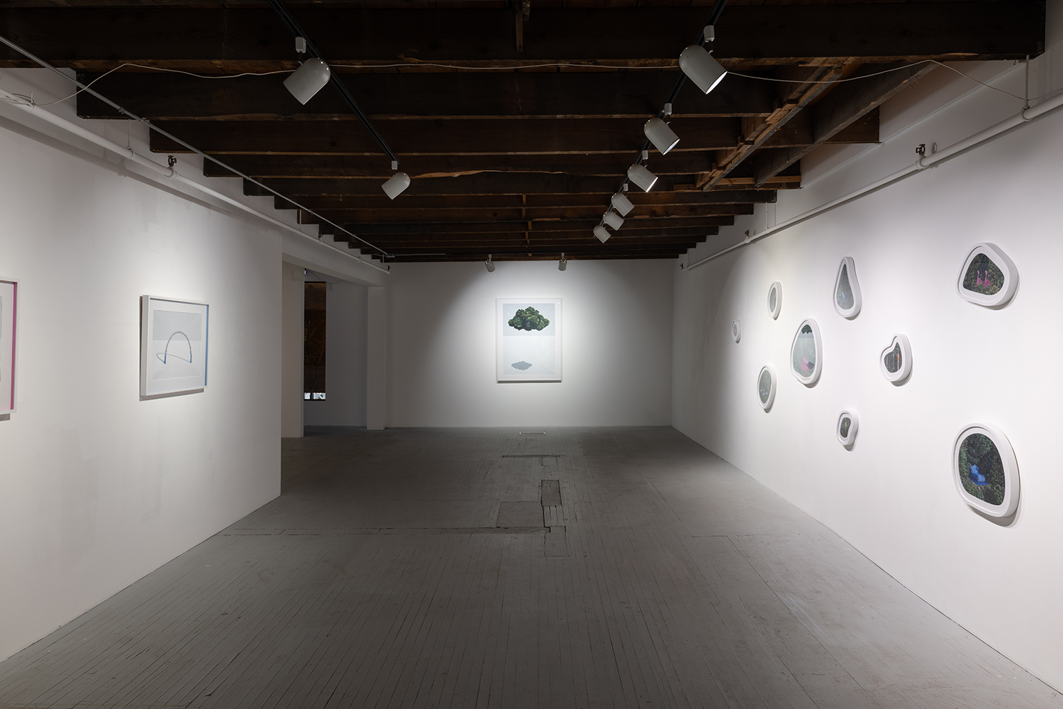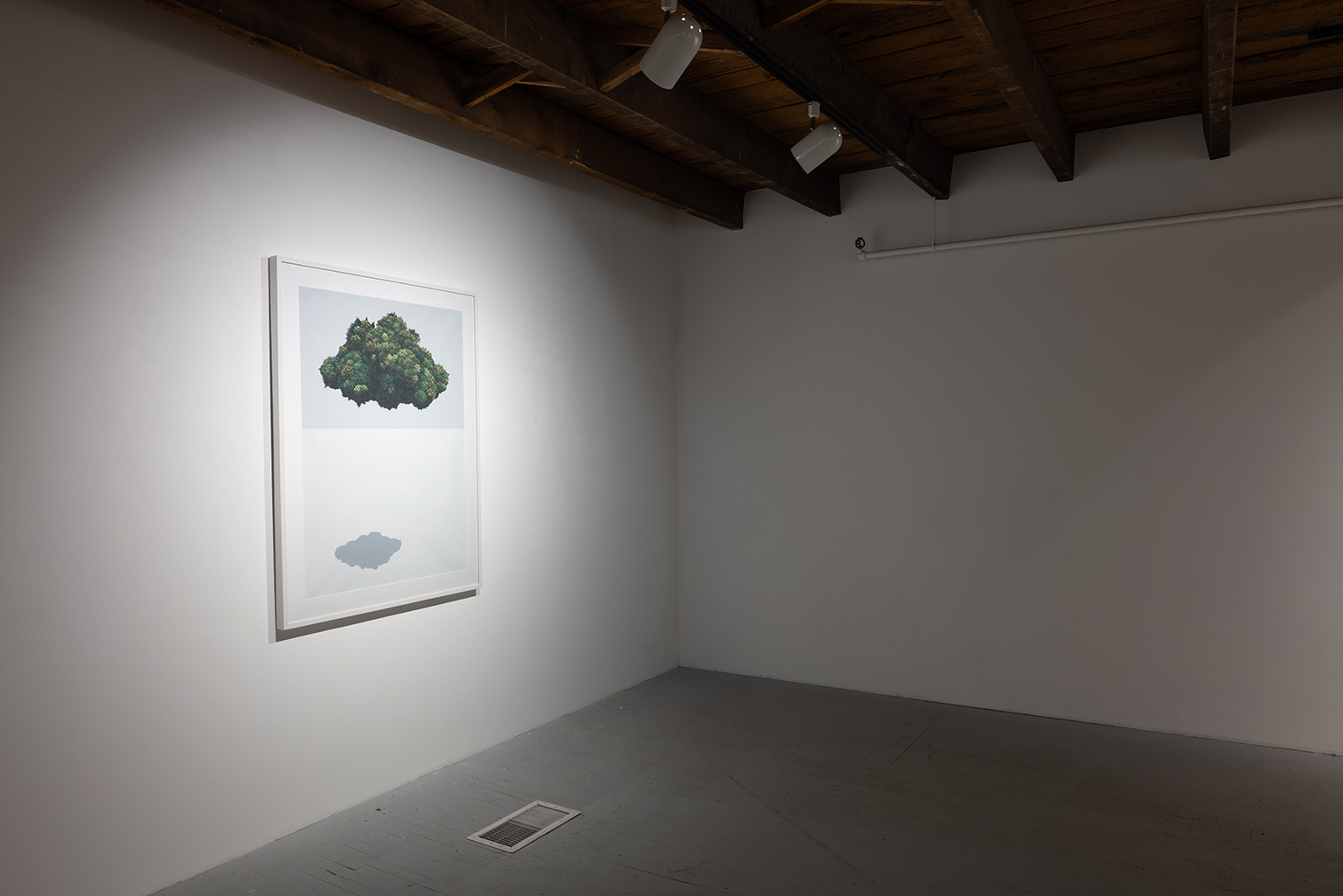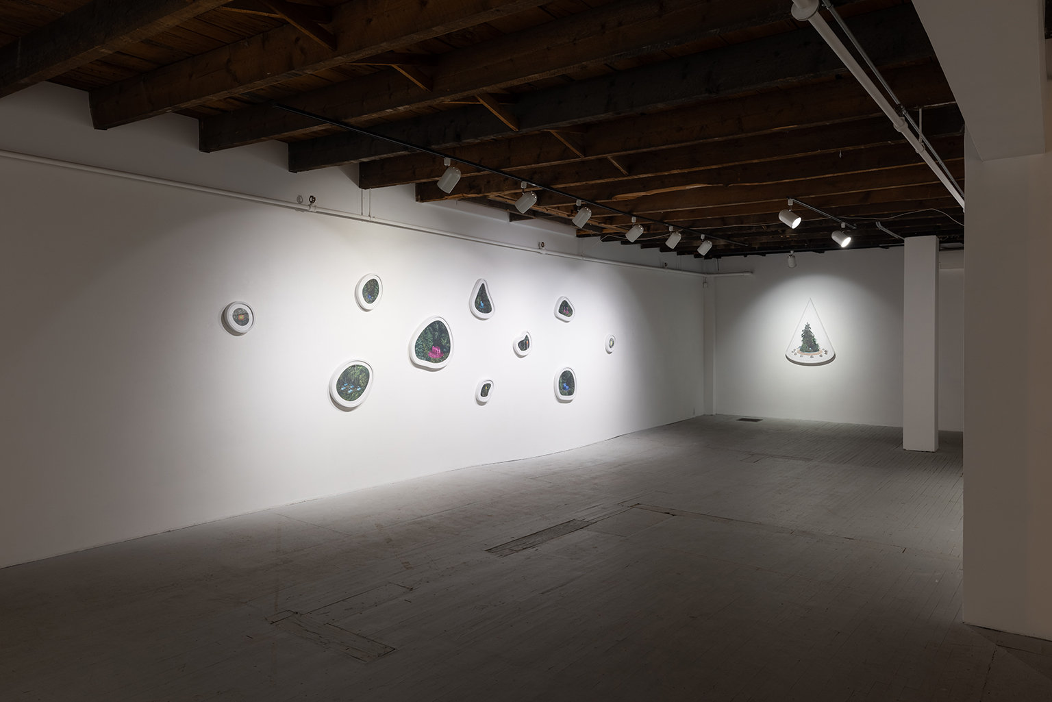 L’ambiguïté que cultive Jazz Keillor entre nature et civilisation se trouve reflétée dans le titre de son exposition : ces images forestières minutieusement dépeintes sont-elles de véritables paysages (« landscape ») ou des mises en scène paysagères (« landscaped ») qui cherchent à faire vrai, parfois juste du bout des lèvres? Car non seulement on retrouve dans ces boisés touffus des objets absurdes tels que des prises électriques et des vélos d’entraînement, mais ceux-ci se parent de couleurs criardes qui mettent en relief leur incongruité. Même les éléments naturels se métamorphosent, comme infectés par le virus de la ville, de la culture, de la technologie : le daim et le lapin prennent des teintes bleu poudre morbides, le tronc du bouleau se plie à l’instar d’un arc roman ou d’un spaghetti, le bosquet devient un nuage qui flotte étrangement au-dessus du sol comme quelque vaisseau-mère extraterrestre.