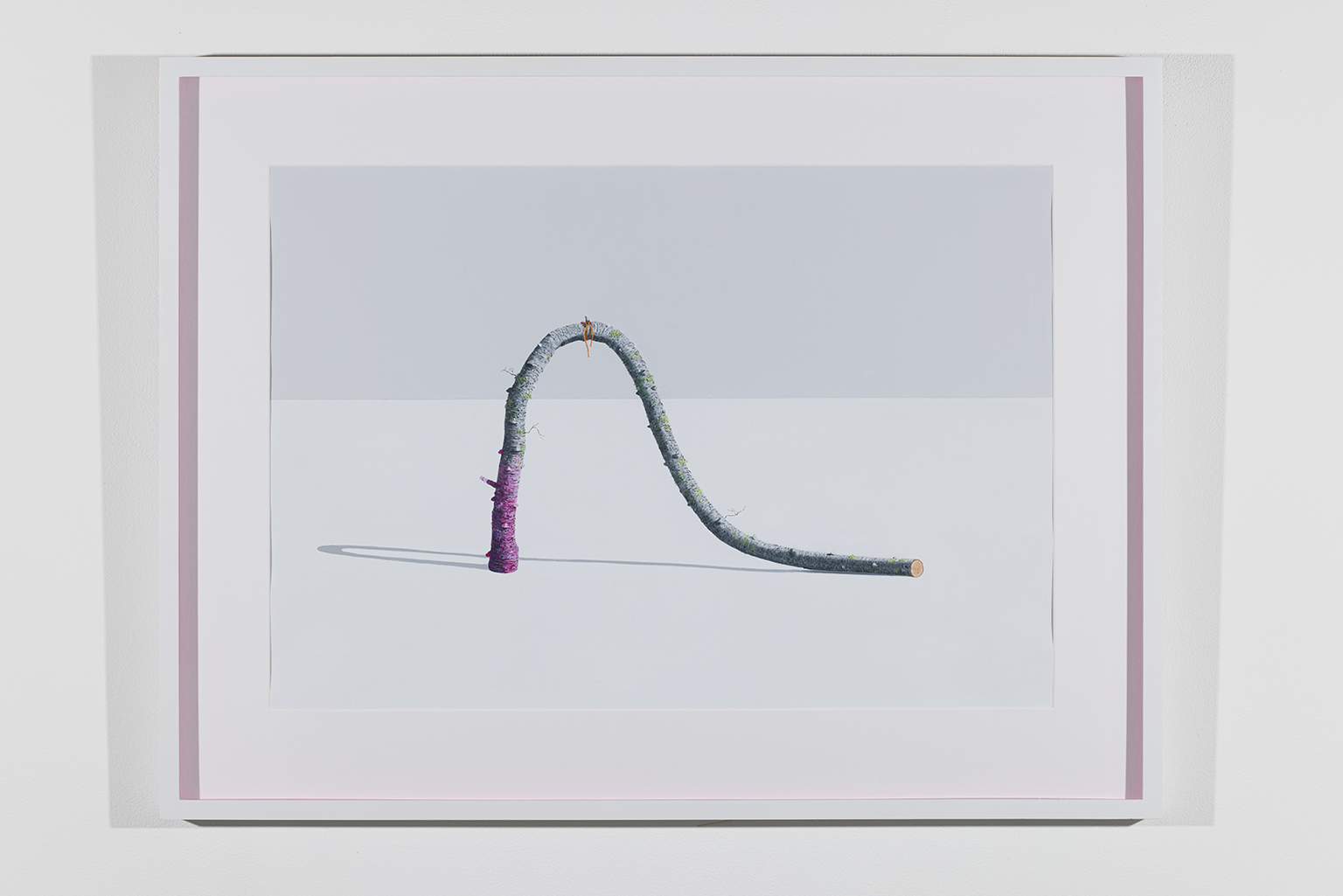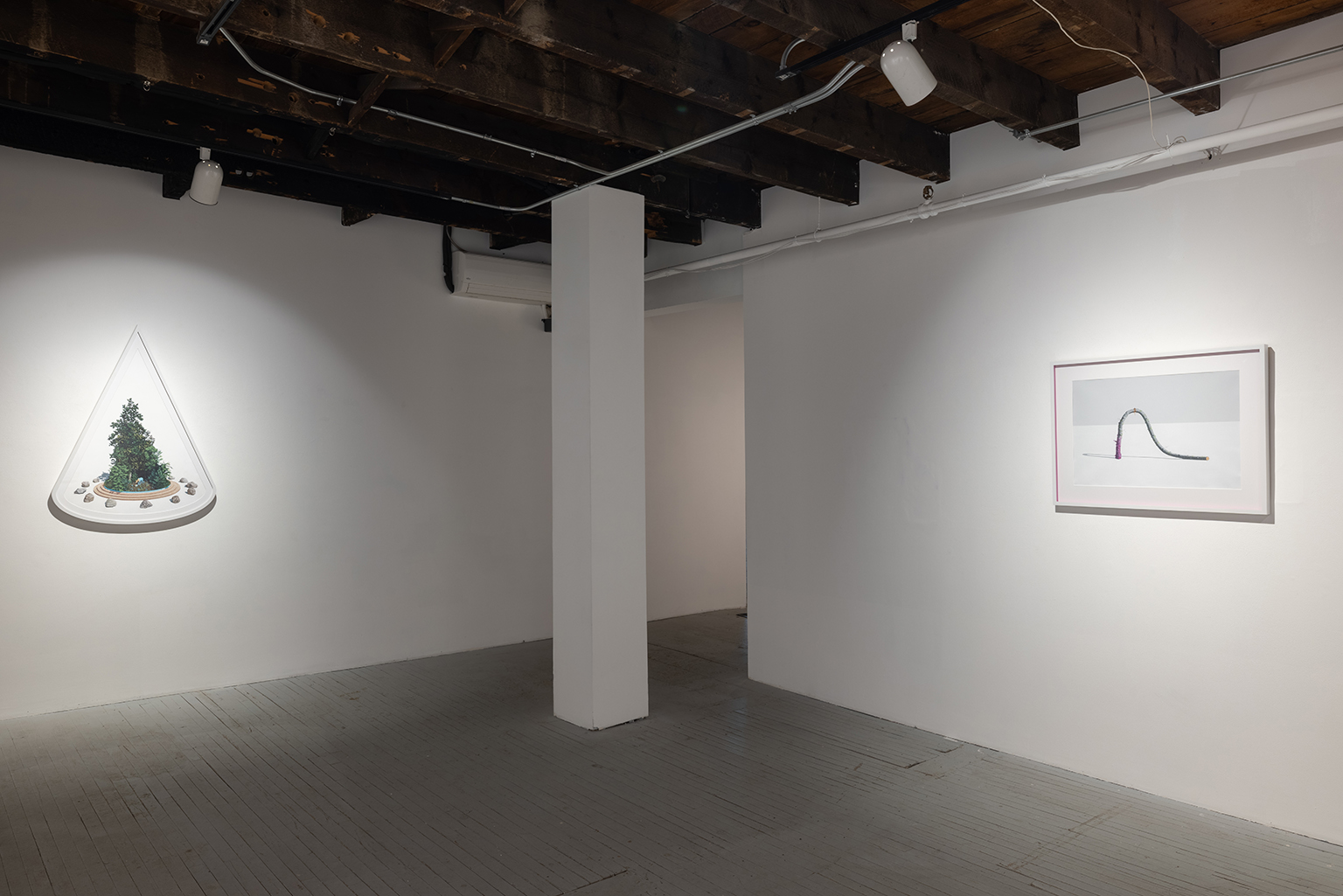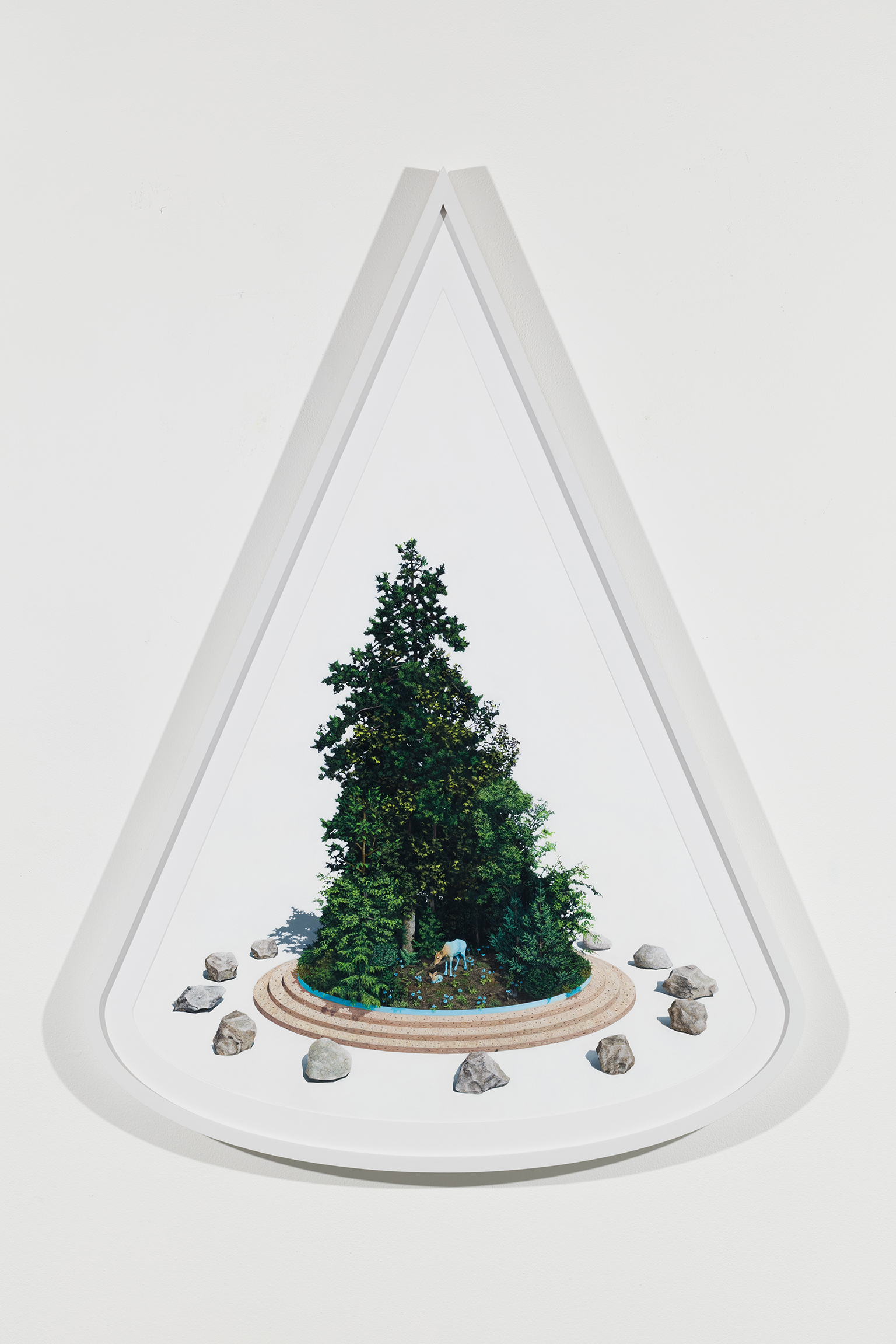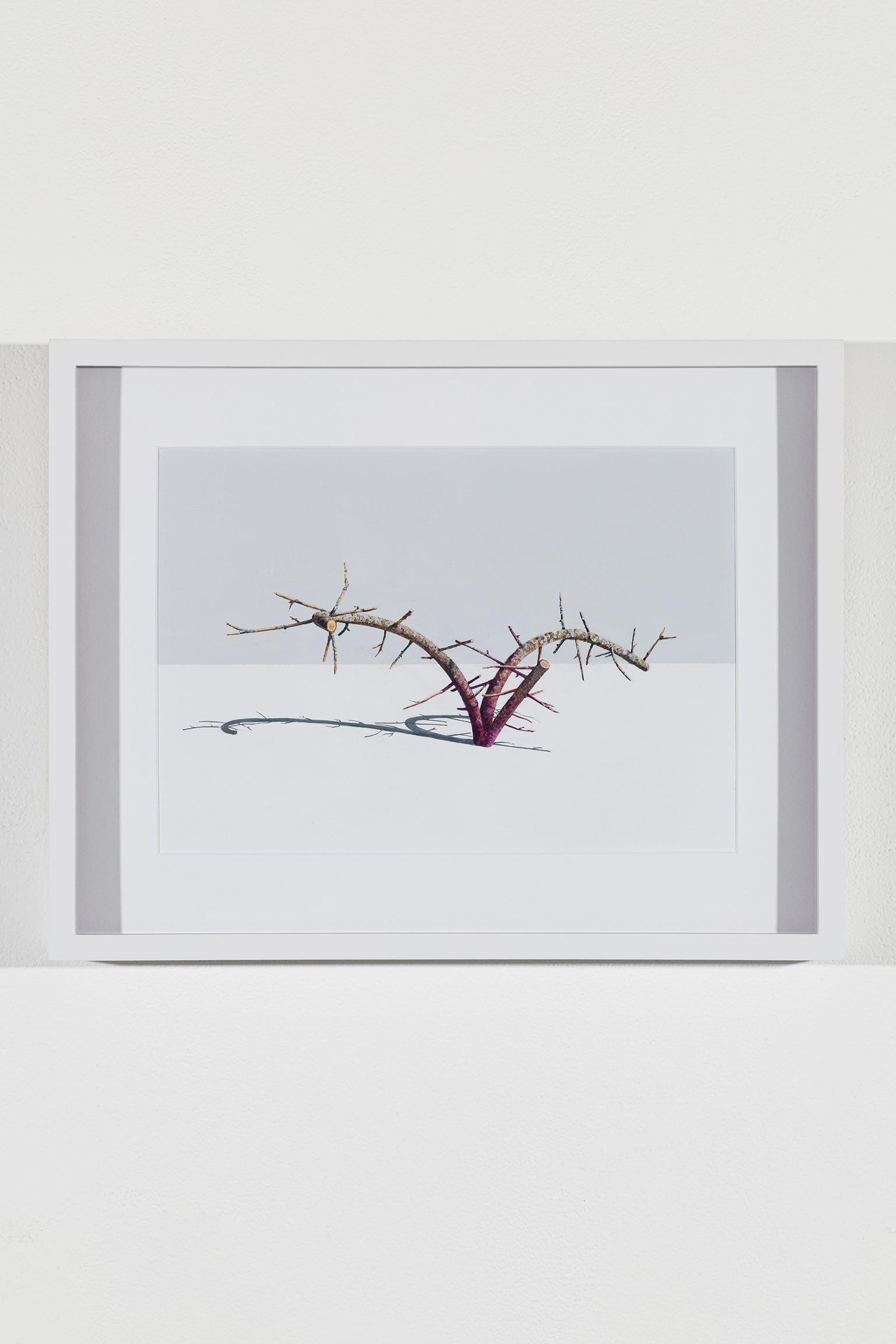 L’ambiguïté que cultive Jazz Keillor entre nature et civilisation se trouve reflétée dans le titre de son exposition : ces images forestières minutieusement dépeintes sont-elles de véritables paysages (« landscape ») ou des mises en scène paysagères (« landscaped ») qui cherchent à faire vrai, parfois juste du bout des lèvres? Car non seulement on retrouve dans ces boisés touffus des objets absurdes tels que des prises électriques et des vélos d’entraînement, mais ceux-ci se parent de couleurs criardes qui mettent en relief leur incongruité. Même les éléments naturels se métamorphosent, comme infectés par le virus de la ville, de la culture, de la technologie : le daim et le lapin prennent des teintes bleu poudre morbides, le tronc du bouleau se plie à l’instar d’un arc roman ou d’un spaghetti, le bosquet devient un nuage qui flotte étrangement au-dessus du sol comme quelque vaisseau-mère extraterrestre.