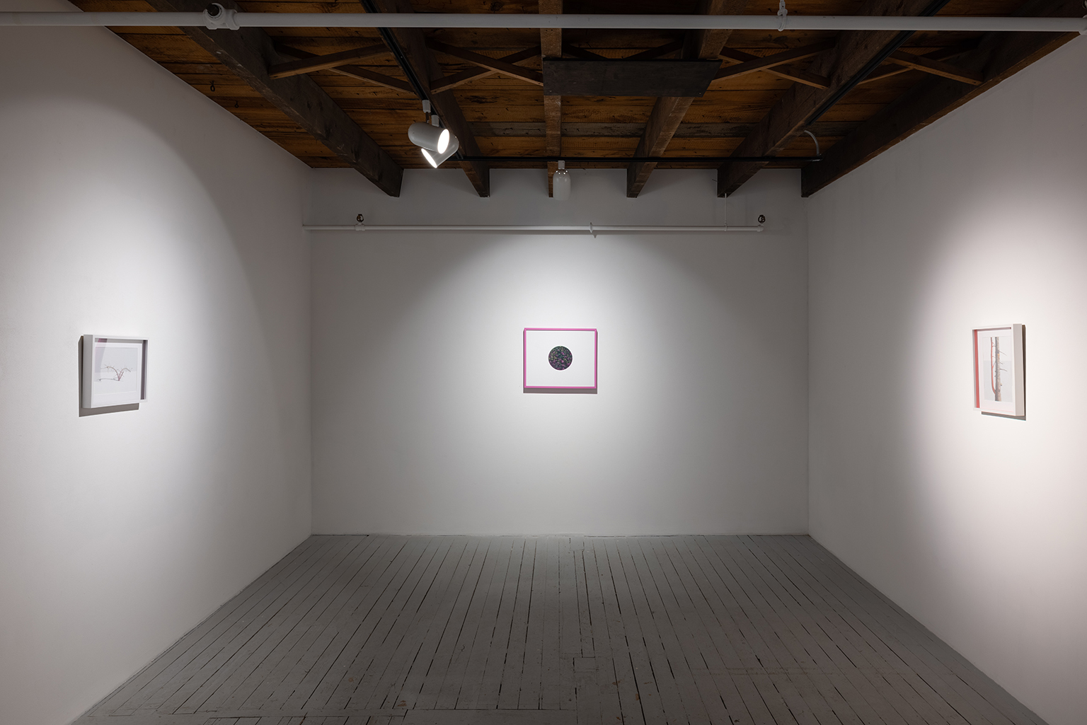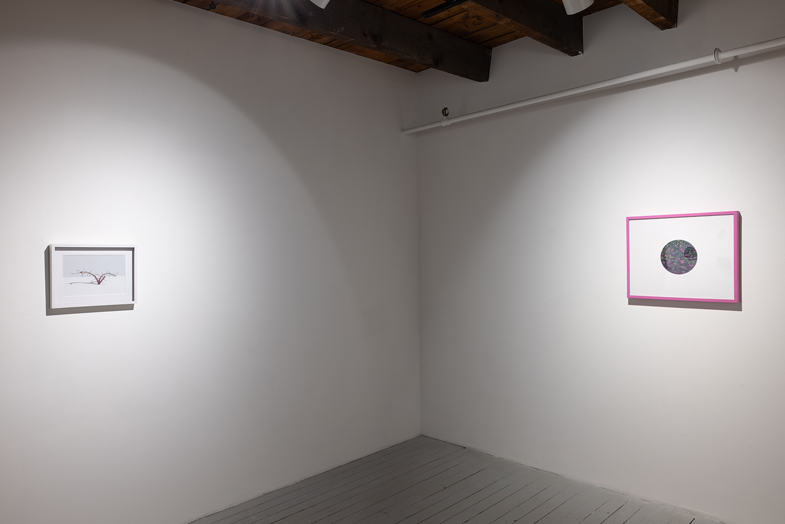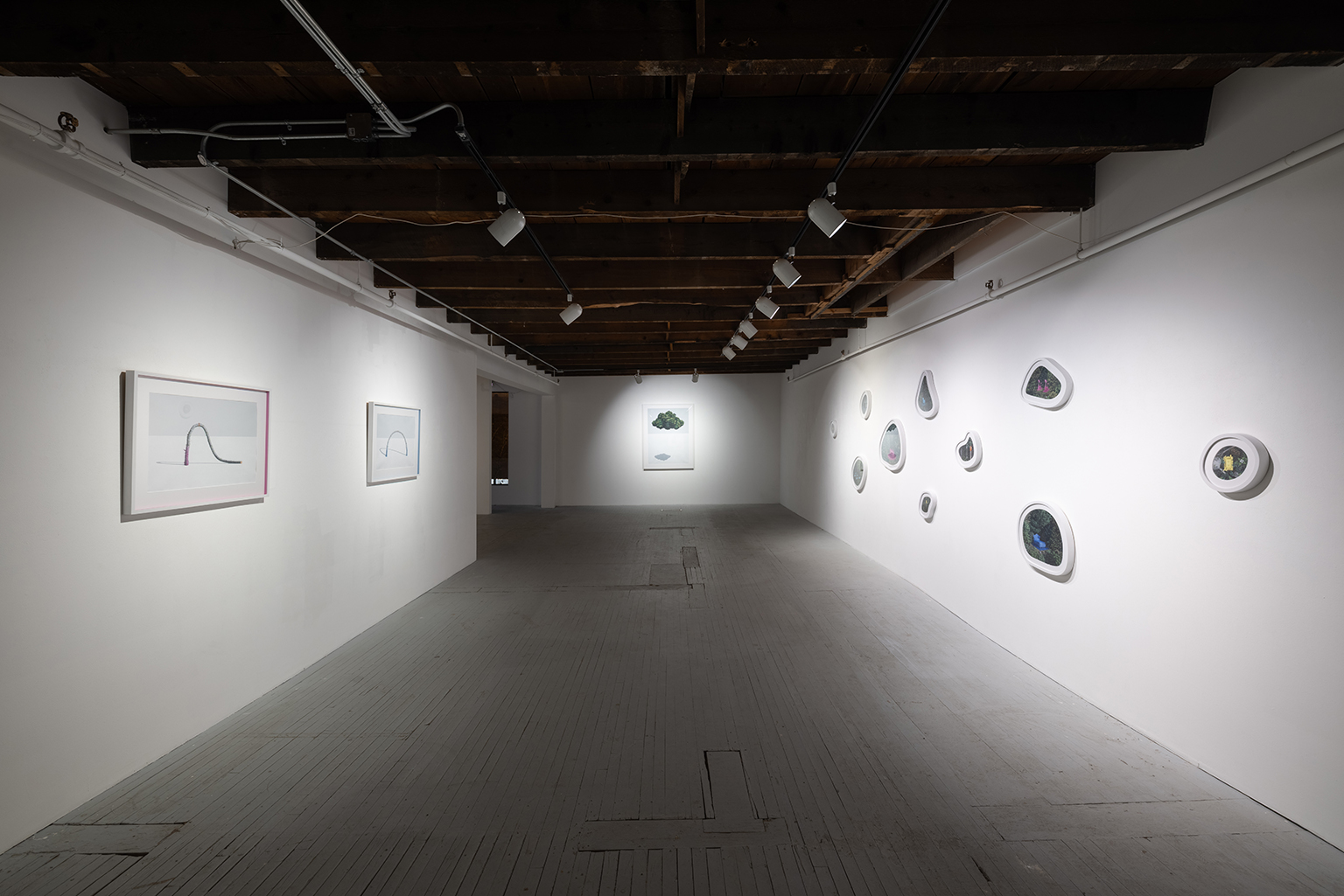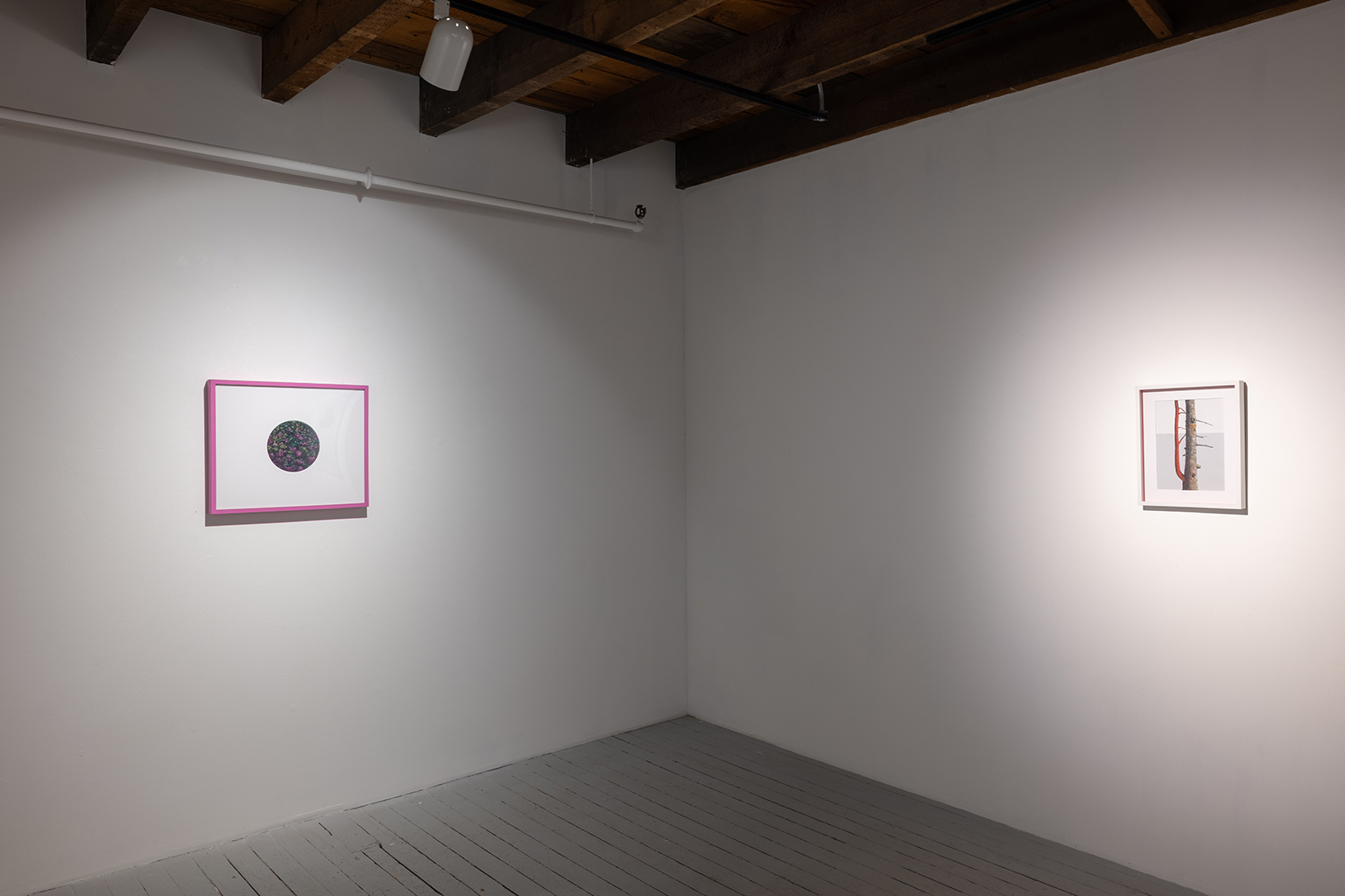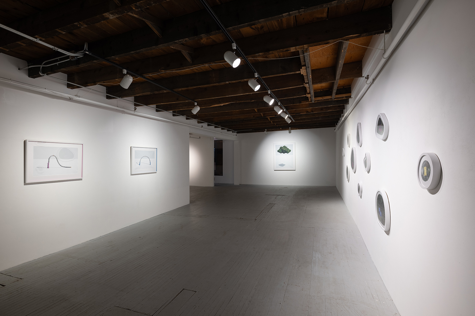 L’ambiguïté que cultive Jazz Keillor entre nature et civilisation se trouve reflétée dans le titre de son exposition : ces images forestières minutieusement dépeintes sont-elles de véritables paysages (« landscape ») ou des mises en scène paysagères (« landscaped ») qui cherchent à faire vrai, parfois juste du bout des lèvres? Car non seulement on retrouve dans ces boisés touffus des objets absurdes tels que des prises électriques et des vélos d’entraînement, mais ceux-ci se parent de couleurs criardes qui mettent en relief leur incongruité. Même les éléments naturels se métamorphosent, comme infectés par le virus de la ville, de la culture, de la technologie : le daim et le lapin prennent des teintes bleu poudre morbides, le tronc du bouleau se plie à l’instar d’un arc roman ou d’un spaghetti, le bosquet devient un nuage qui flotte étrangement au-dessus du sol comme quelque vaisseau-mère extraterrestre.