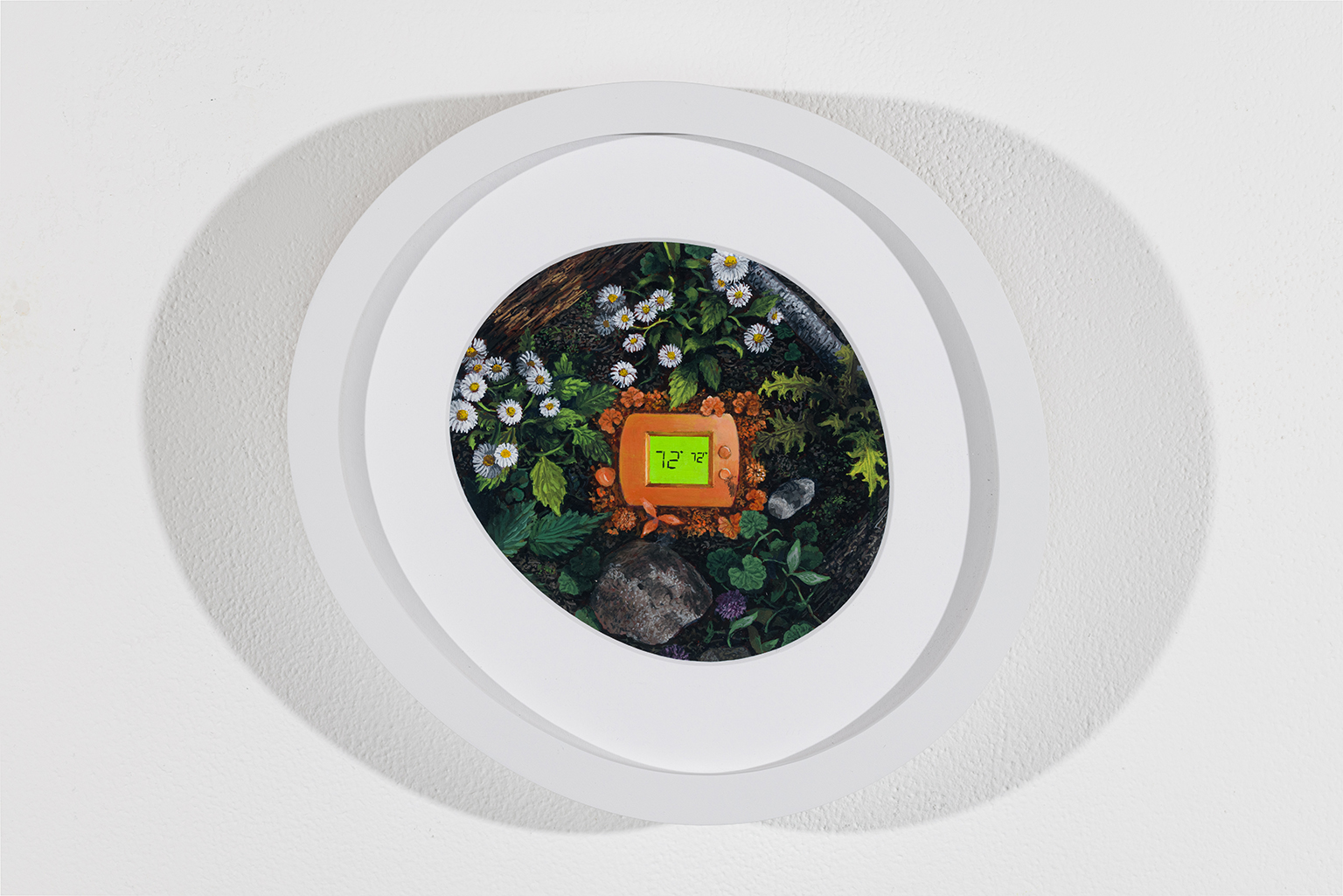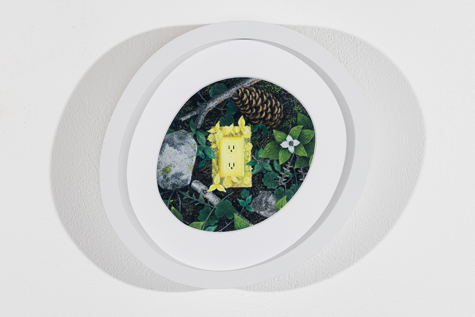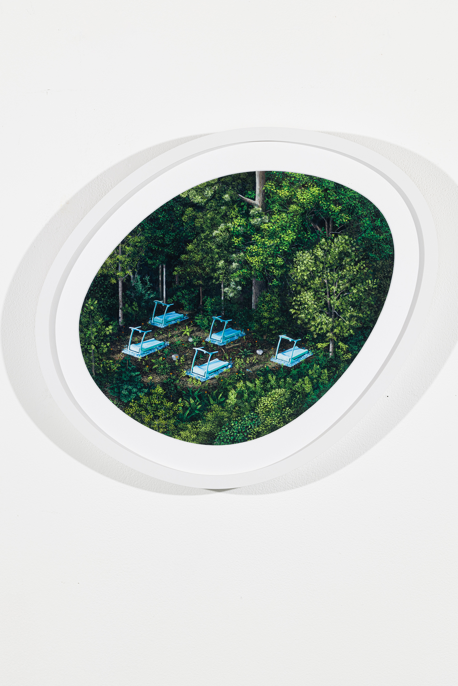 Ces scènes étranges ne sont pas sans rappeler les croisements inattendus pour lesquels le surréalisme éprouve de la prédilection. On pense aux juxtapositions d’objets de Magritte ou de Dali. Chez Jazz Keillor, ces miniatures singulières ne se veulent pas l’expression de l’inconscient, mais des commentaires sociaux. Elles parlent du pouvoir que l’humain exerce sur son environnement. L’angoisse freudienne est ici remplacée par l’anxiété écologique. Le propos reste subtil : nulle prise de position campée, nulle dénonciation indignée. Plutôt une exploration de ce qui se trouve au carrefour de certains courants contemporains, qui nous paraissent aller de soi et dont se révèle l’absurdité pour peu qu’on prenne un pas de recul : l’asservissement de la nature et le culte du naturel, la recherche d’authenticité et la dépendance aux produits usinés, la mode du glamping, du cocooning et du workout. Ces peintures se présentent ainsi comme des condensés de nos névroses collectives.
