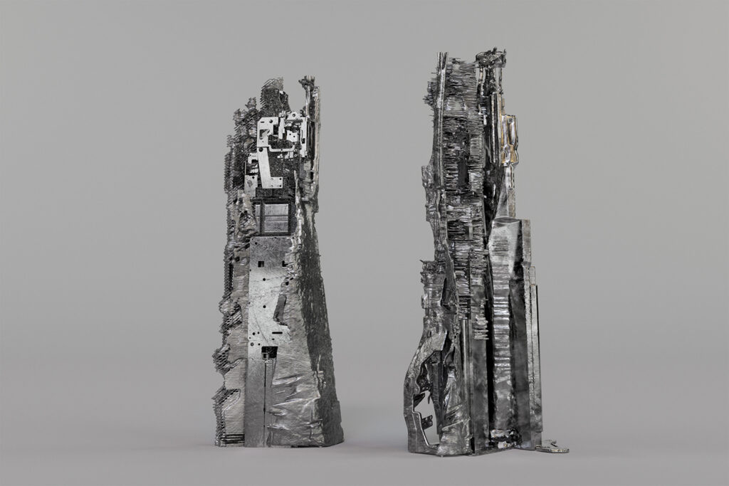 Lamarche et Dubeau n’offrent pas de réponses simples. Ils se tournent plutôt vers des stratégies plurielles pour repenser la fragilité des liens entre la nature et la technologie, puis entre une mémoire du passé et un avenir spéculé. Leur travail en duo, qui croise des approches médiatiques (modélisation 3D, réalité virtuelle et imagerie numérique) et plastiques (sculpture, installation), interroge le fil invisible qui relie le tangible à l’immatériel et le réel à l’imaginaire. Les technologies invitées, souvent imaginées à tort comme des prolongements détachés et rompus du geste humain, sont ici investies en tant que langages vivants, porteurs de sens, menant aussi bien à une forme de contemplation qu’à des questionnements essentiels, existentiels. L’aluminium, matériau industriel et froid, devient par l’activation des artistes une matière vibrante à mi-chemin entre le minéral et l’organique; puis les sculptures ainsi formées, loin d’être inertes, deviennent des corps qui captent tels des antennes ce qui les entoure, invitant par rebond à l’introspection et à la projection.
