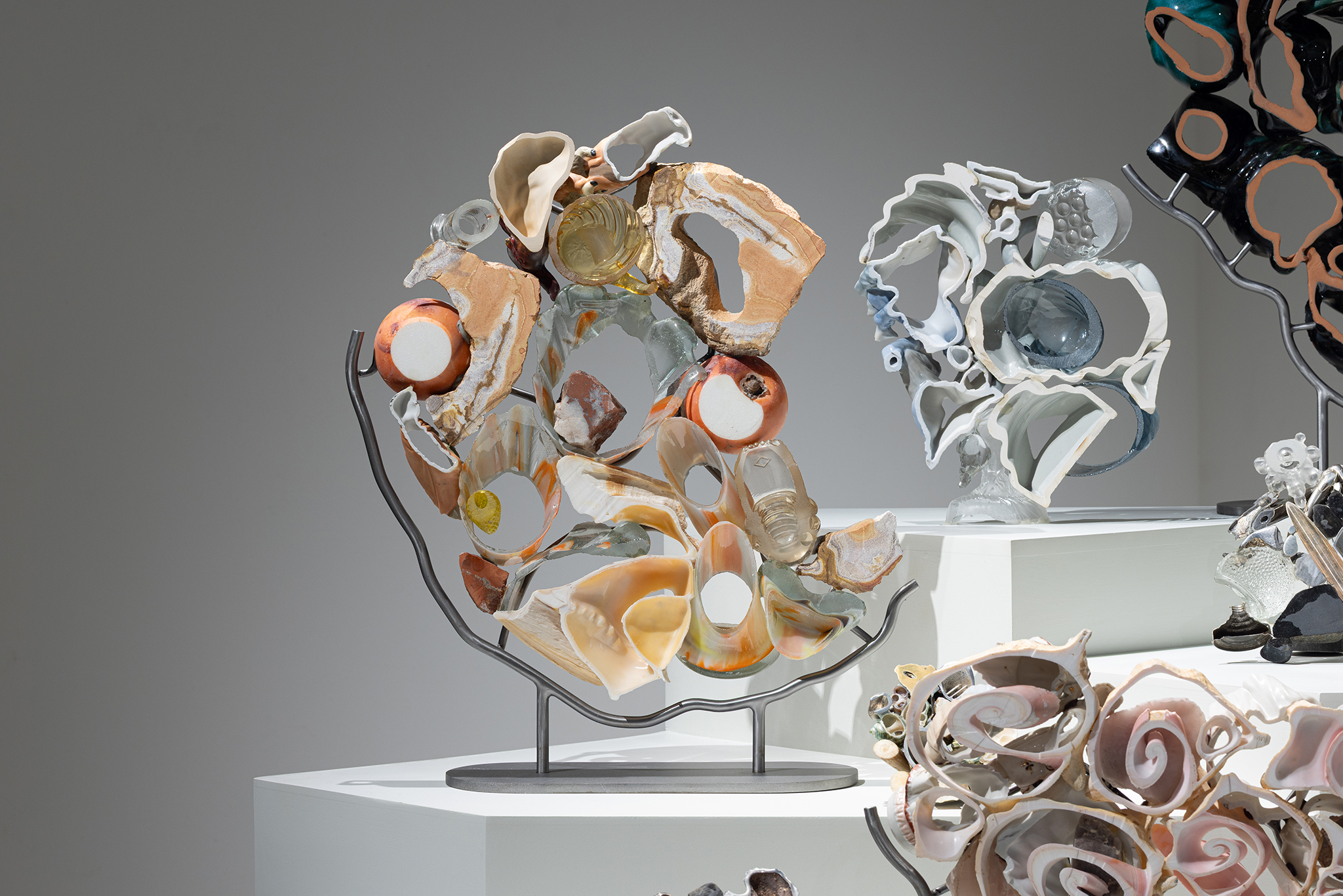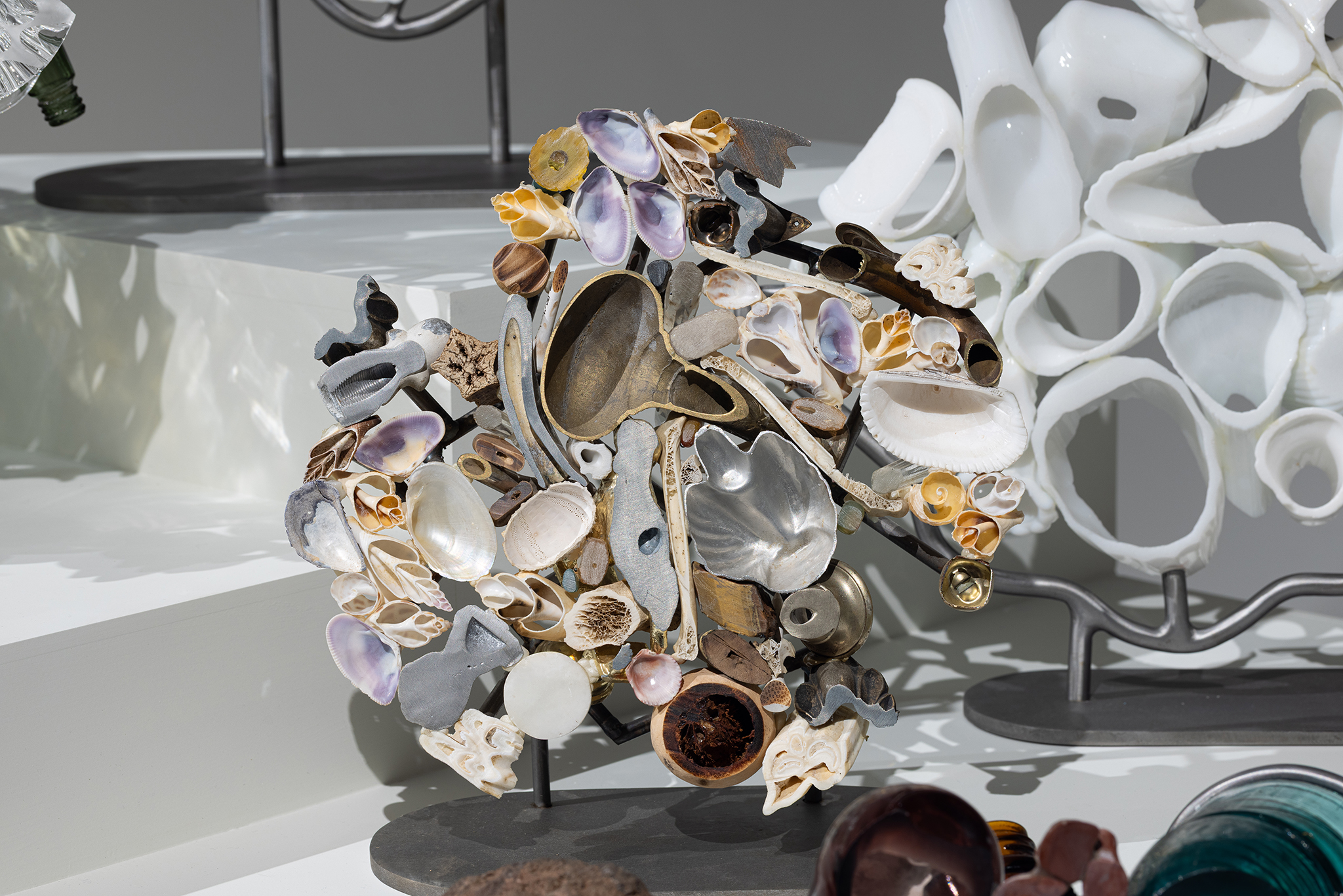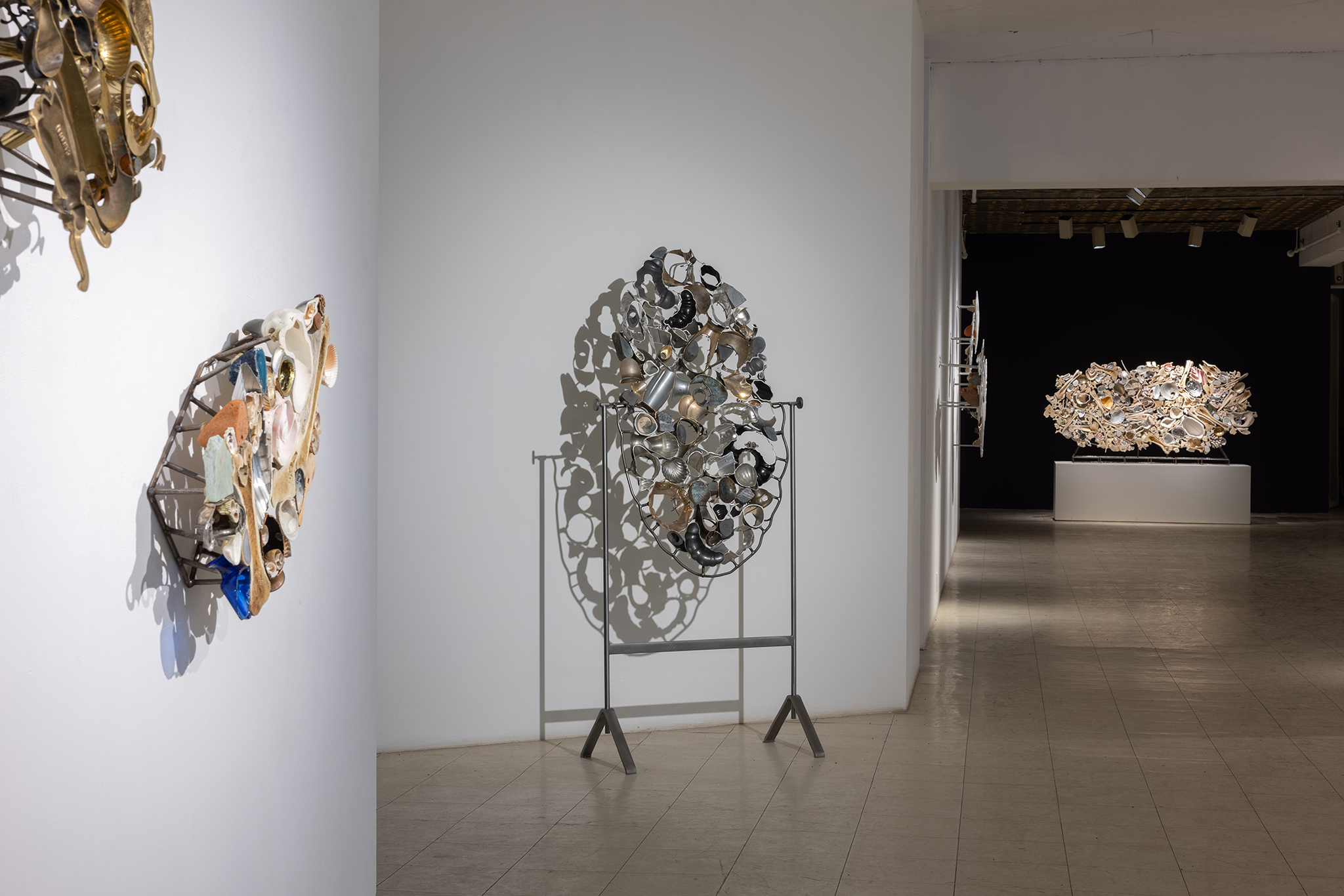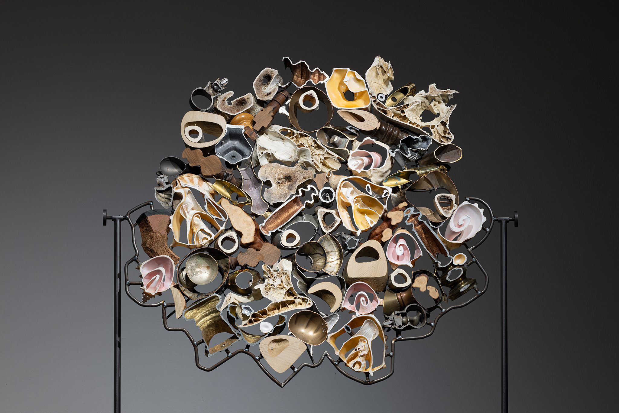 Les sculptures présentées dans l’exposition sont constituées d’éléments variés – ossements, coquillages, verre, céramique et de nombreux autres matériaux récupérés – découpés de manière à en révéler la structure interne. Dans l’œuvre Cross Section I (2024), soutenue par des armatures d’acier, les fragments semblent flotter dans l’espace, maintenus dans une tension constante entre stabilité et précarité. Le regard circule alors entre les surfaces mises à nu, les vides et les structures de soutien, révélant un intérêt pour ce qui relie les éléments autant que pour ce qui les compose.