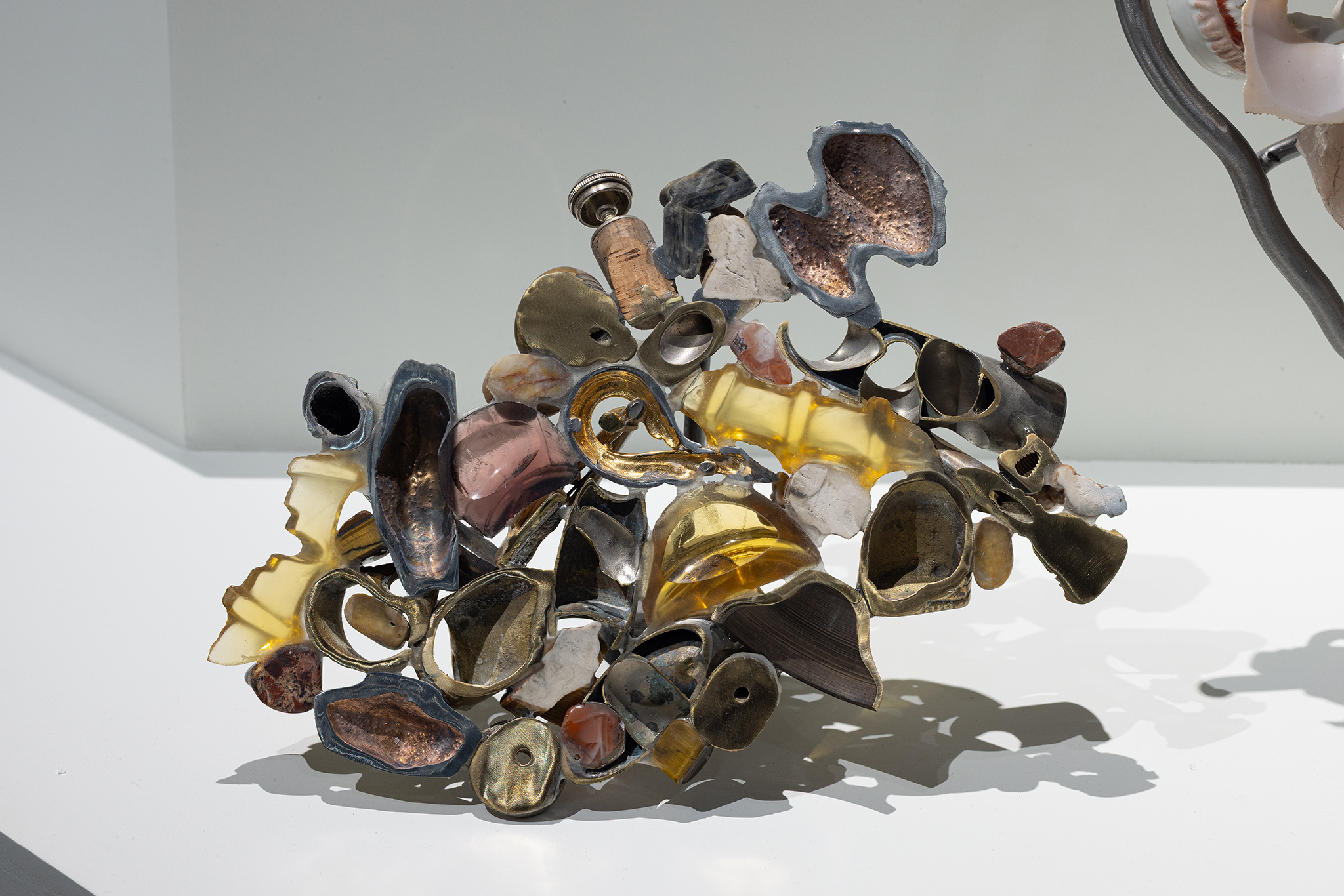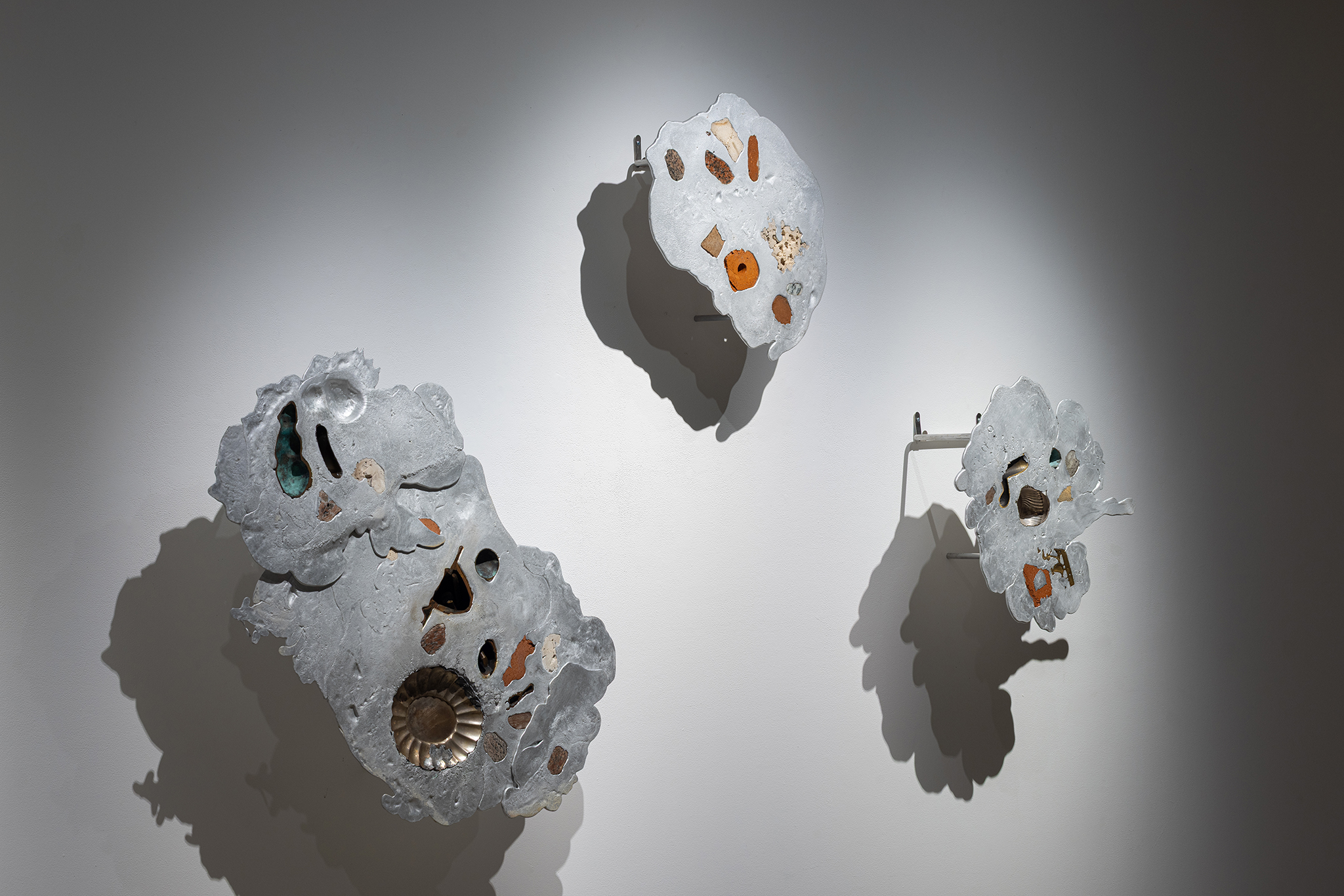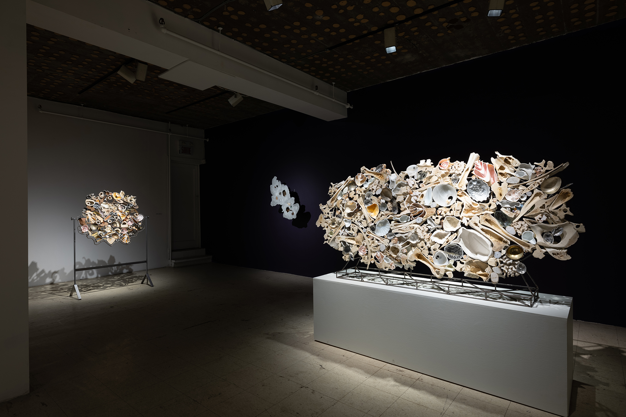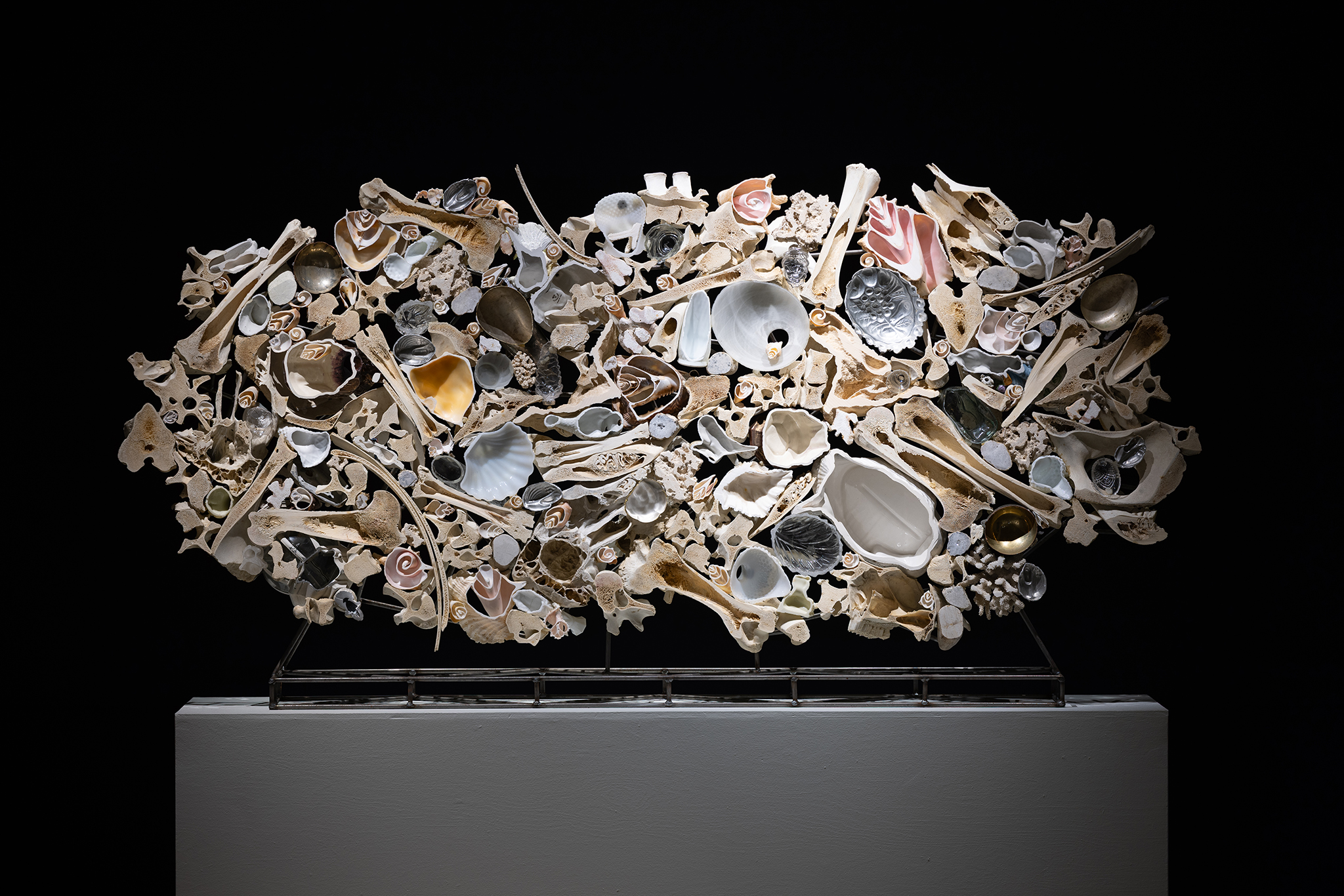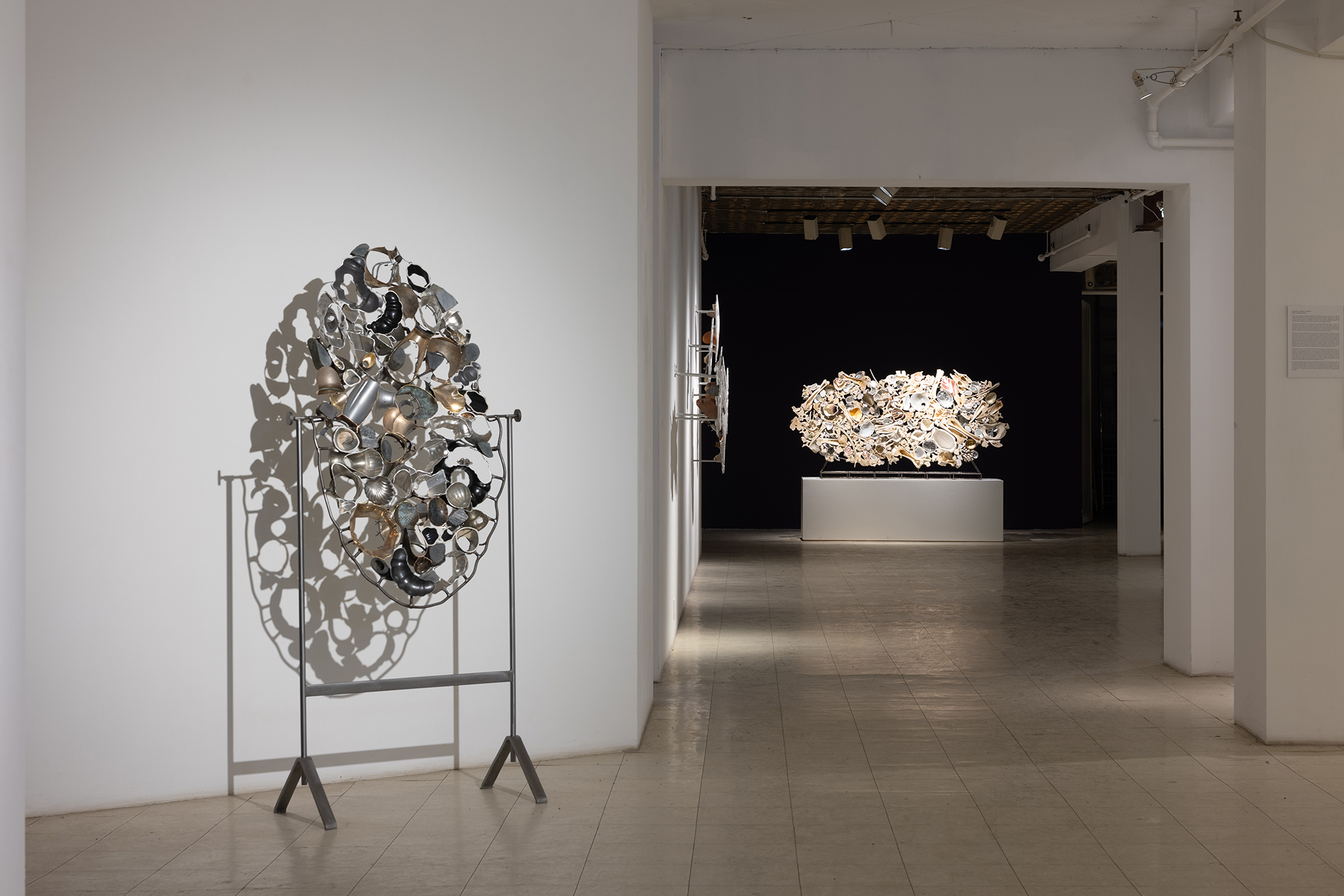 Les sculptures présentées dans l’exposition sont constituées d’éléments variés – ossements, coquillages, verre, céramique et de nombreux autres matériaux récupérés – découpés de manière à en révéler la structure interne. Dans l’œuvre Cross Section I (2024), soutenue par des armatures d’acier, les fragments semblent flotter dans l’espace, maintenus dans une tension constante entre stabilité et précarité. Le regard circule alors entre les surfaces mises à nu, les vides et les structures de soutien, révélant un intérêt pour ce qui relie les éléments autant que pour ce qui les compose.