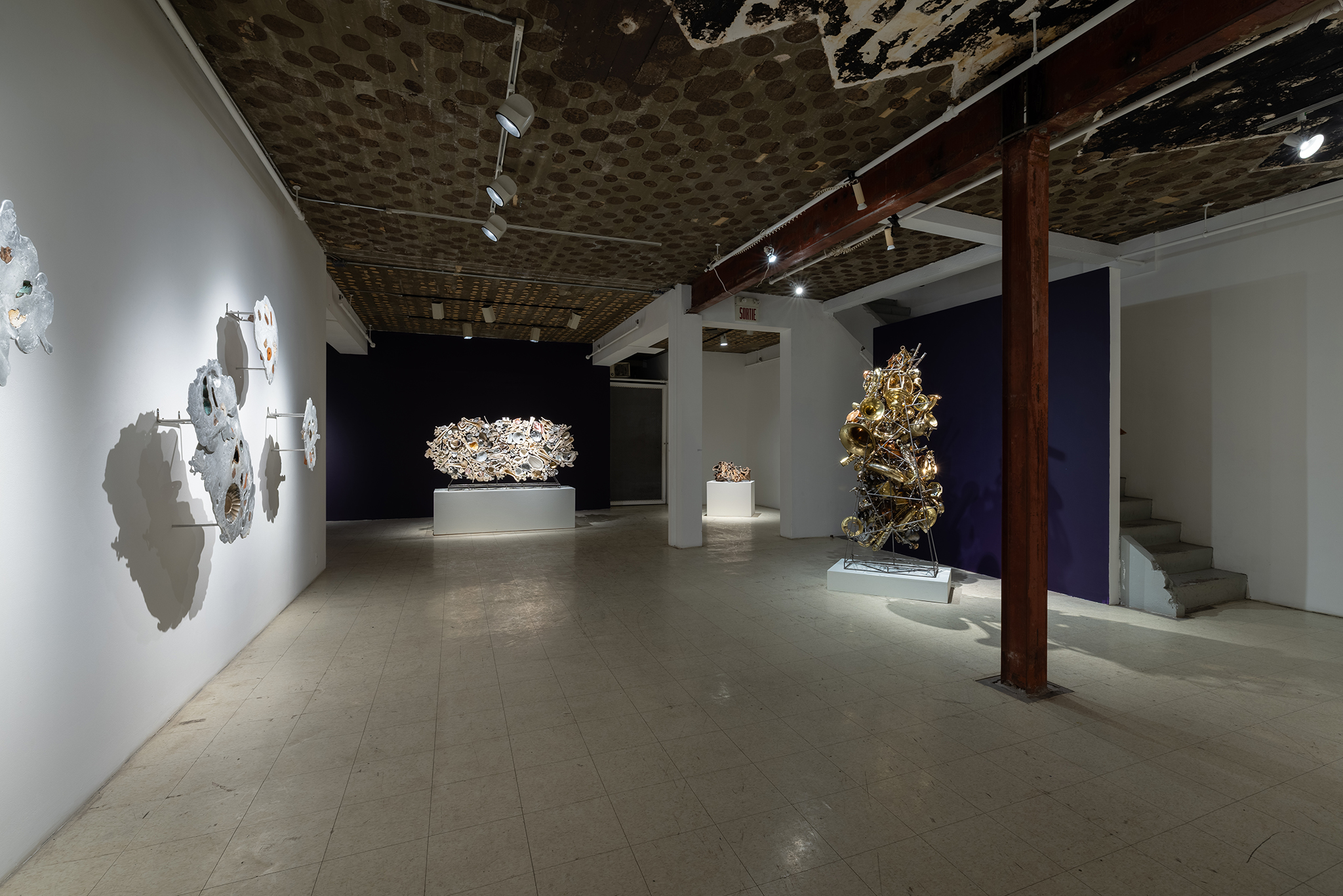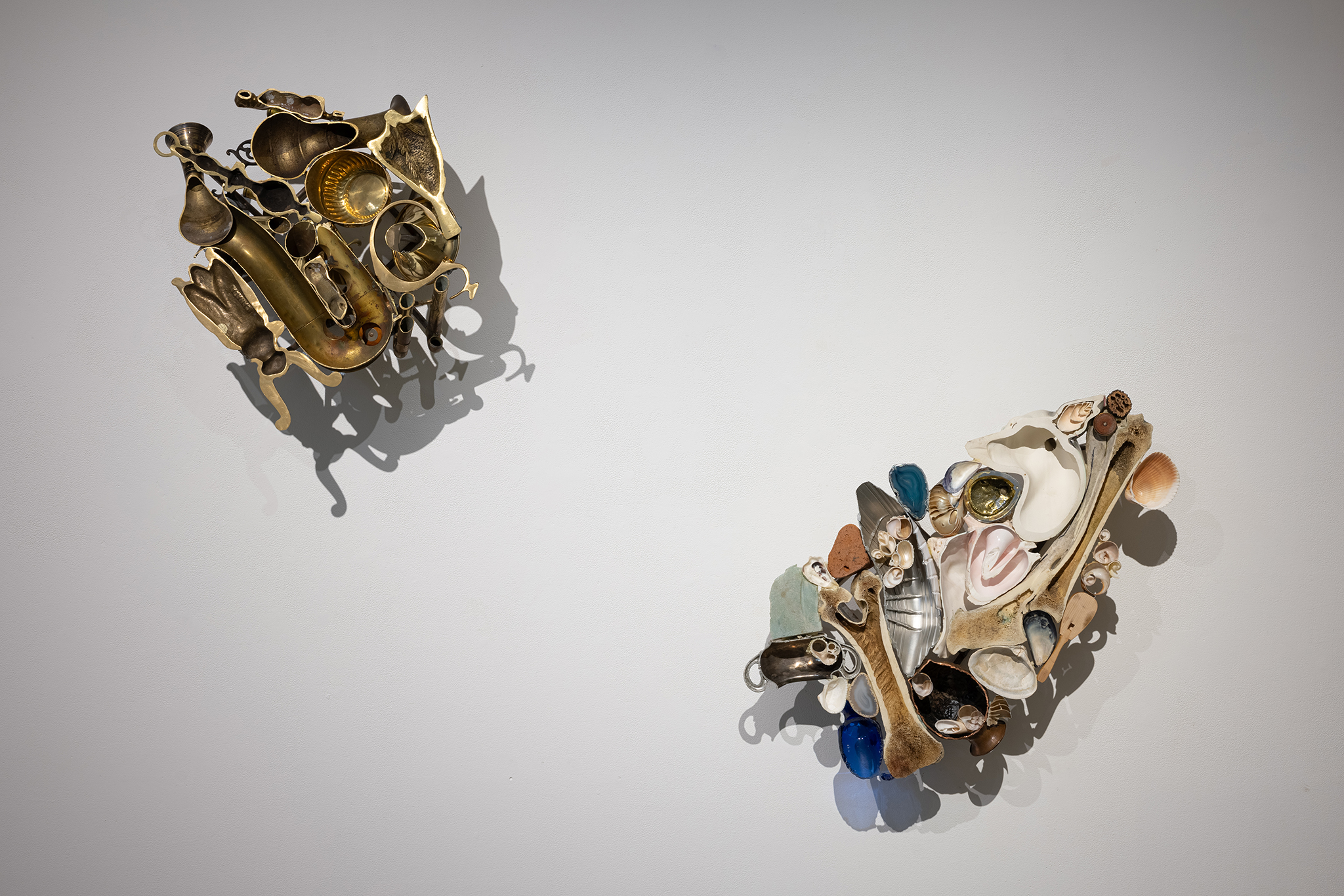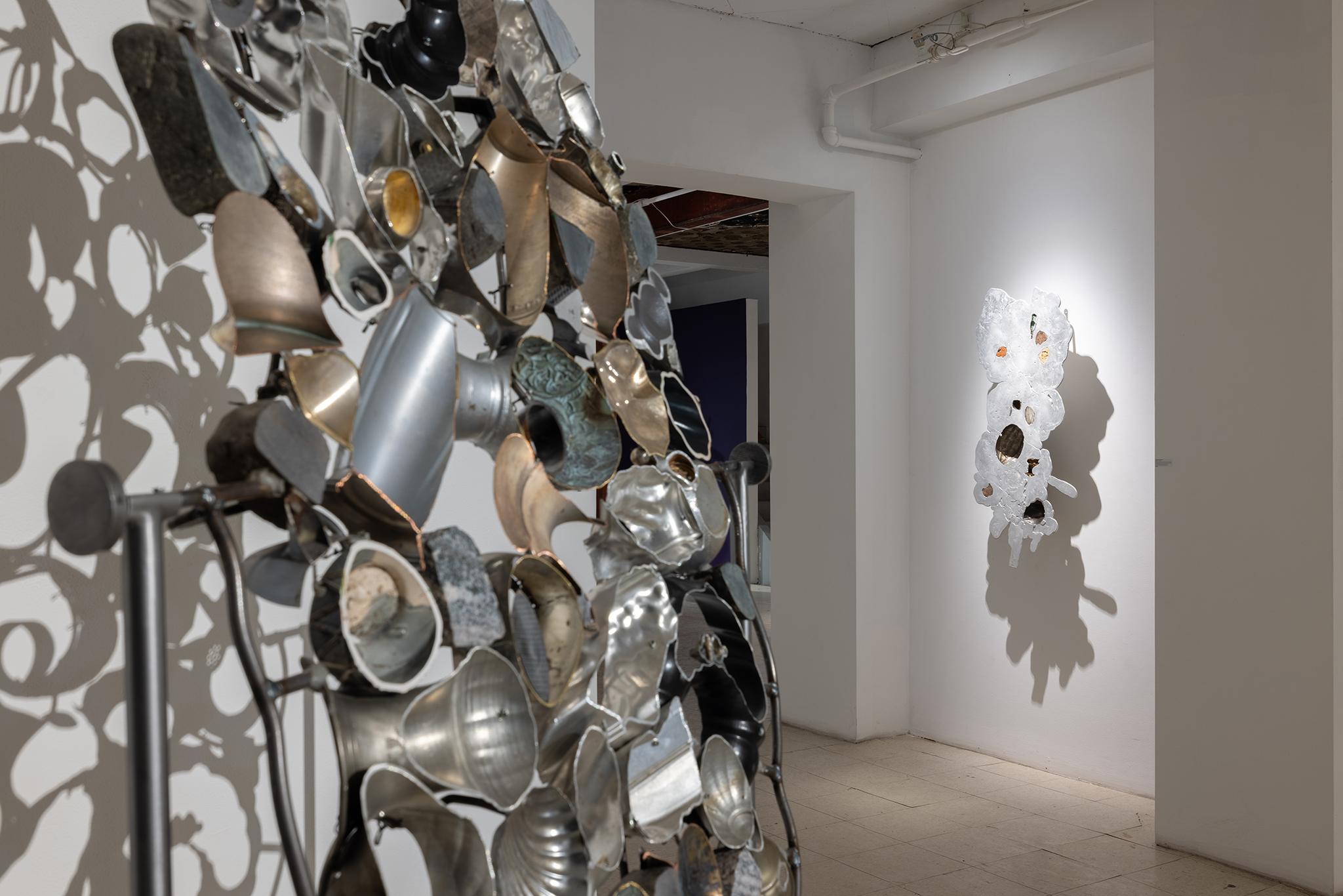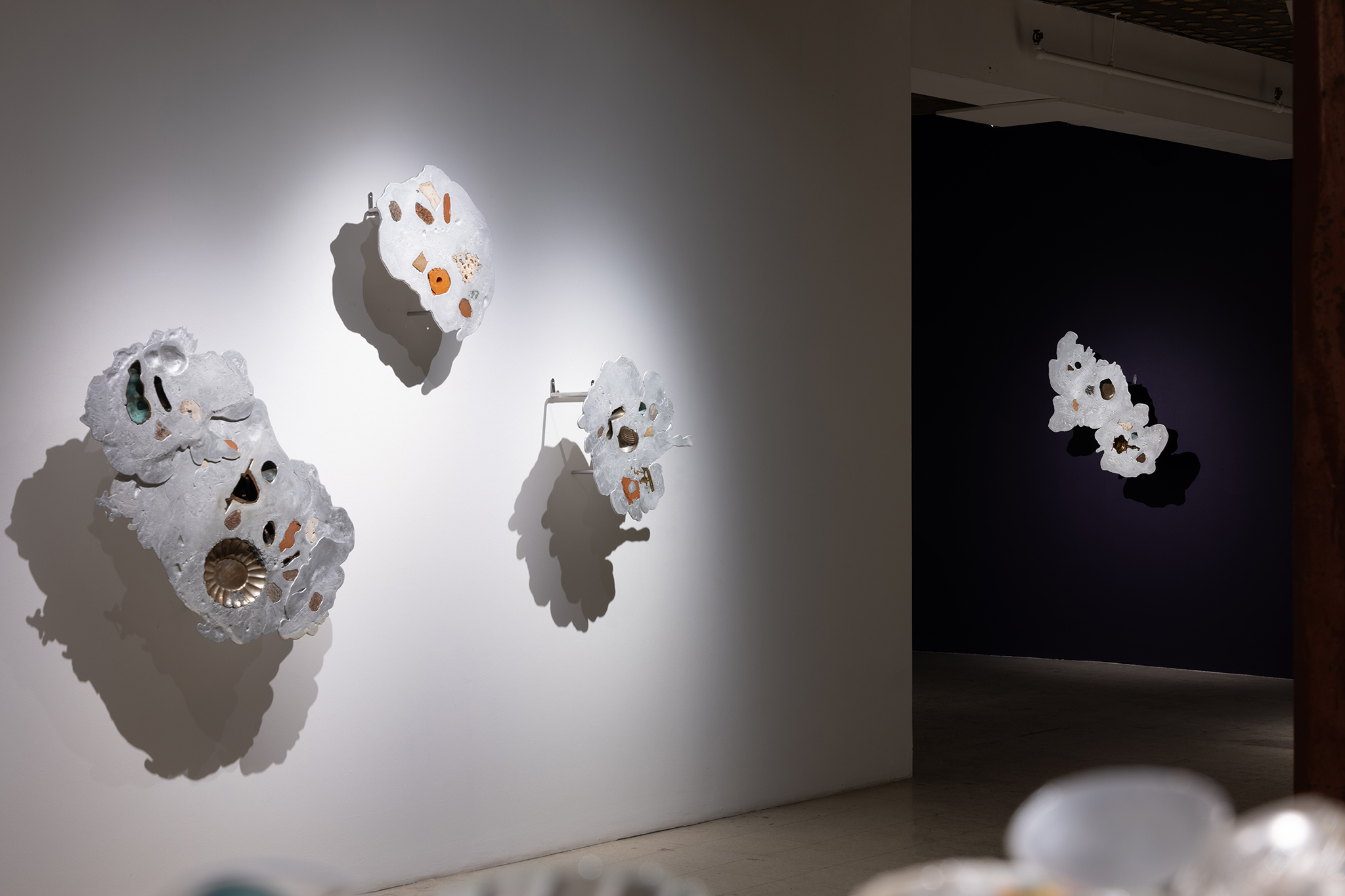 Les sculptures présentées dans l’exposition sont constituées d’éléments variés – ossements, coquillages, verre, céramique et de nombreux autres matériaux récupérés – découpés de manière à en révéler la structure interne. Dans l’œuvre Cross Section I (2024), soutenue par des armatures d’acier, les fragments semblent flotter dans l’espace, maintenus dans une tension constante entre stabilité et précarité. Le regard circule alors entre les surfaces mises à nu, les vides et les structures de soutien, révélant un intérêt pour ce qui relie les éléments autant que pour ce qui les compose.