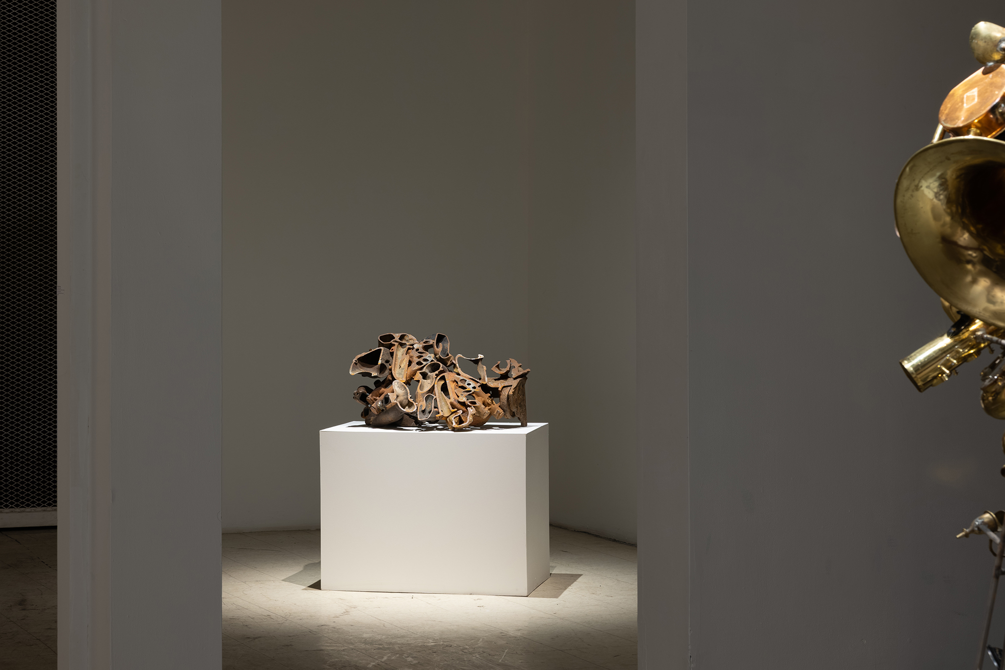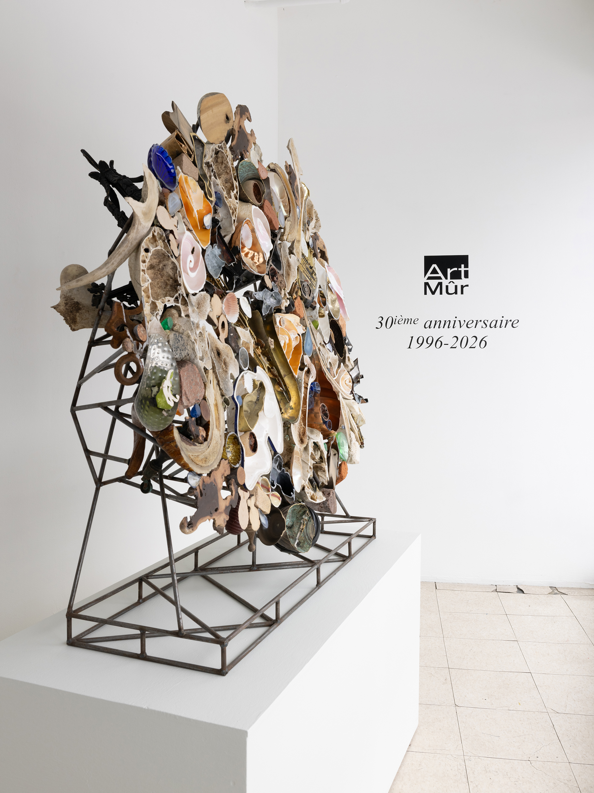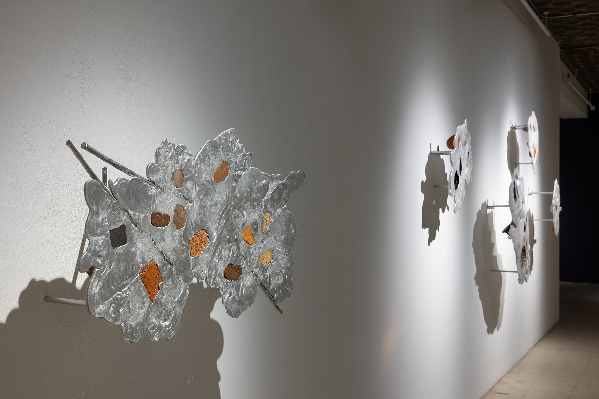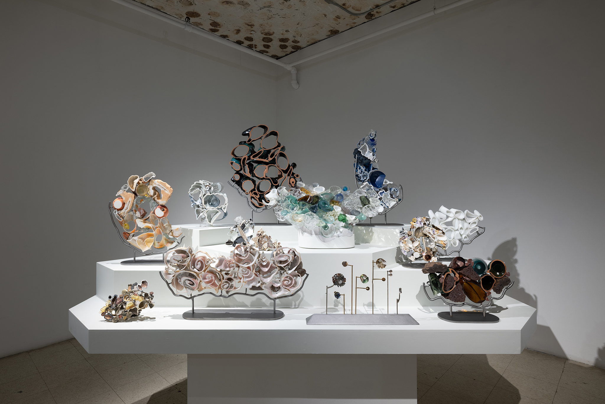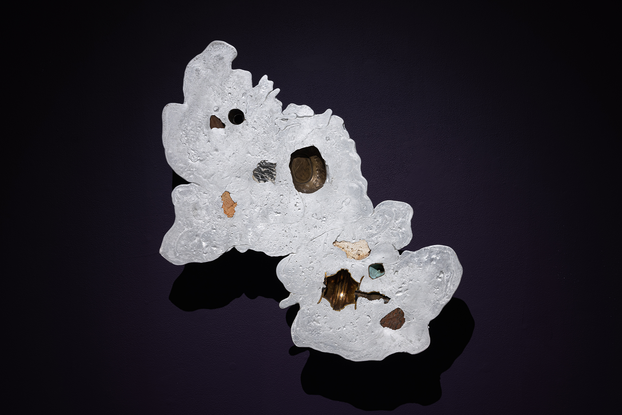 Les sculptures présentées dans l’exposition sont constituées d’éléments variés – ossements, coquillages, verre, céramique et de nombreux autres matériaux récupérés – découpés de manière à en révéler la structure interne. Dans l’œuvre Cross Section I (2024), soutenue par des armatures d’acier, les fragments semblent flotter dans l’espace, maintenus dans une tension constante entre stabilité et précarité. Le regard circule alors entre les surfaces mises à nu, les vides et les structures de soutien, révélant un intérêt pour ce qui relie les éléments autant que pour ce qui les compose.