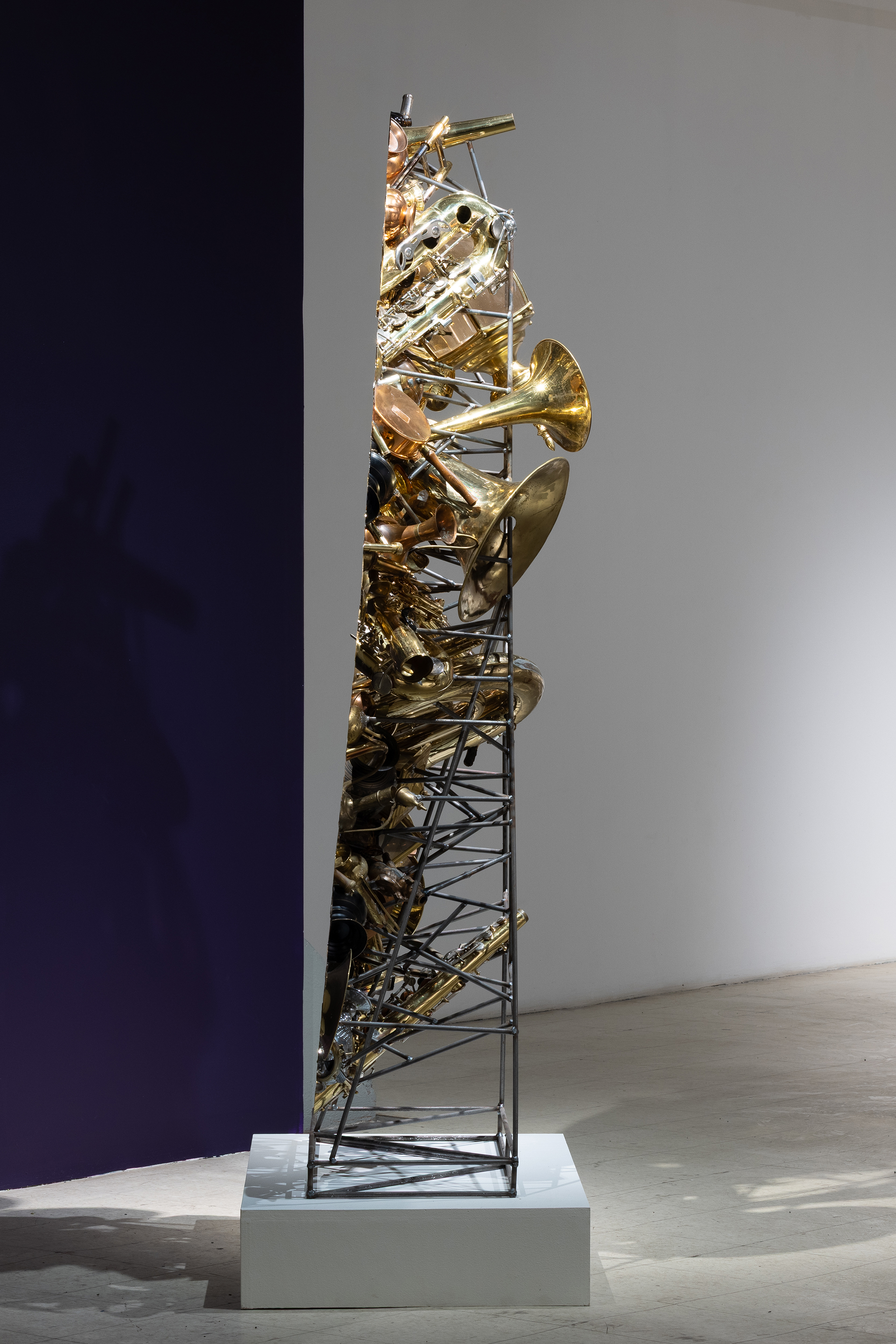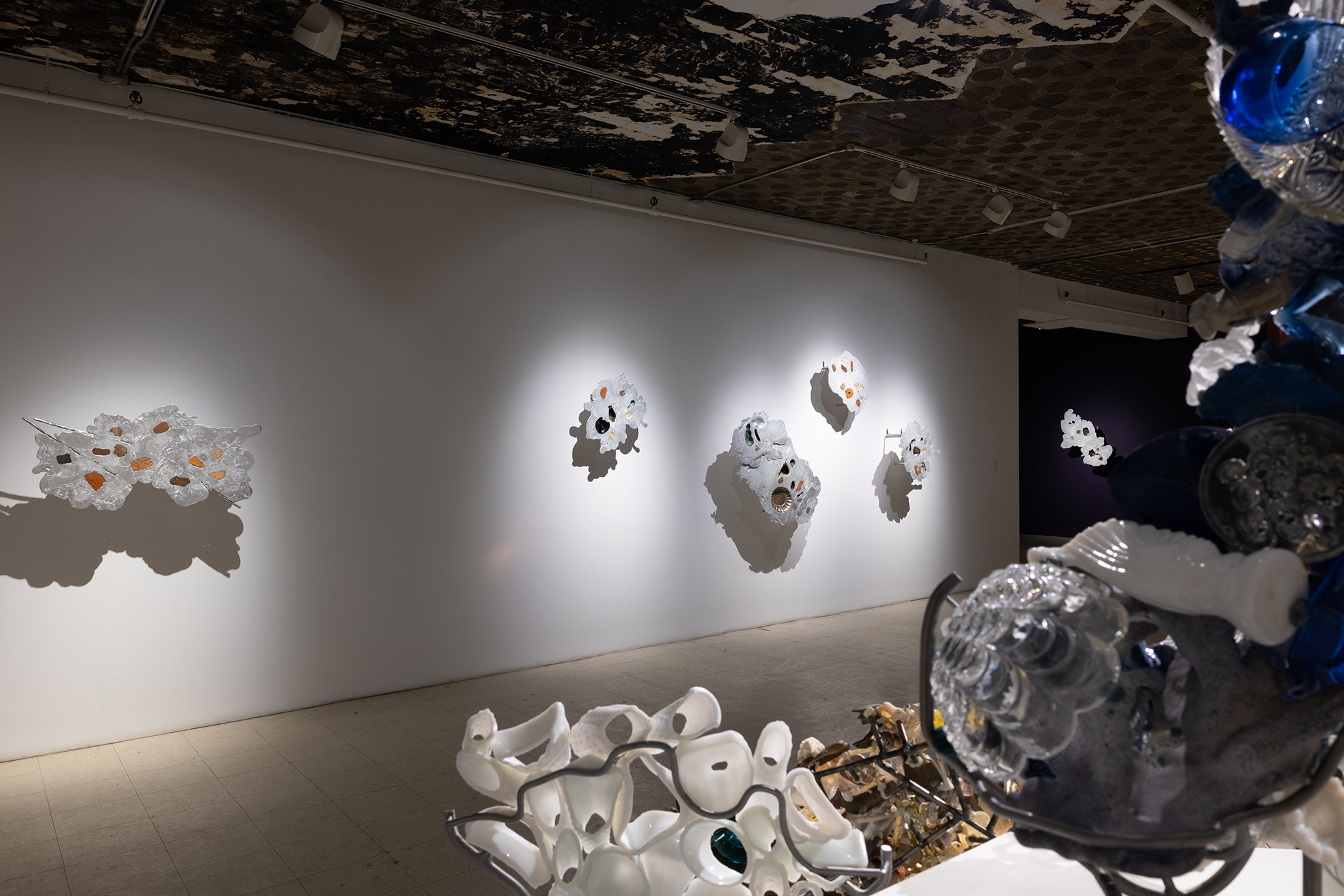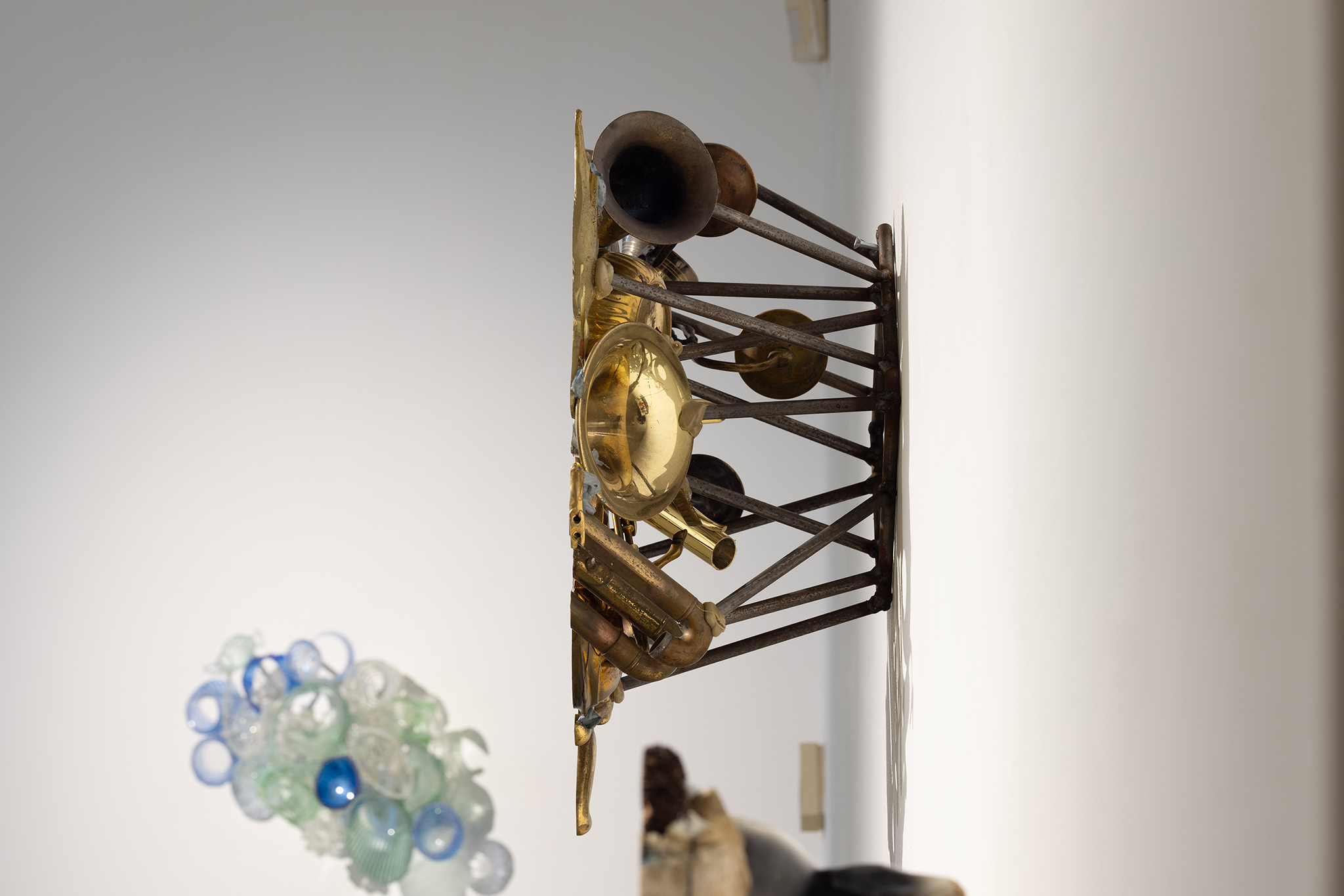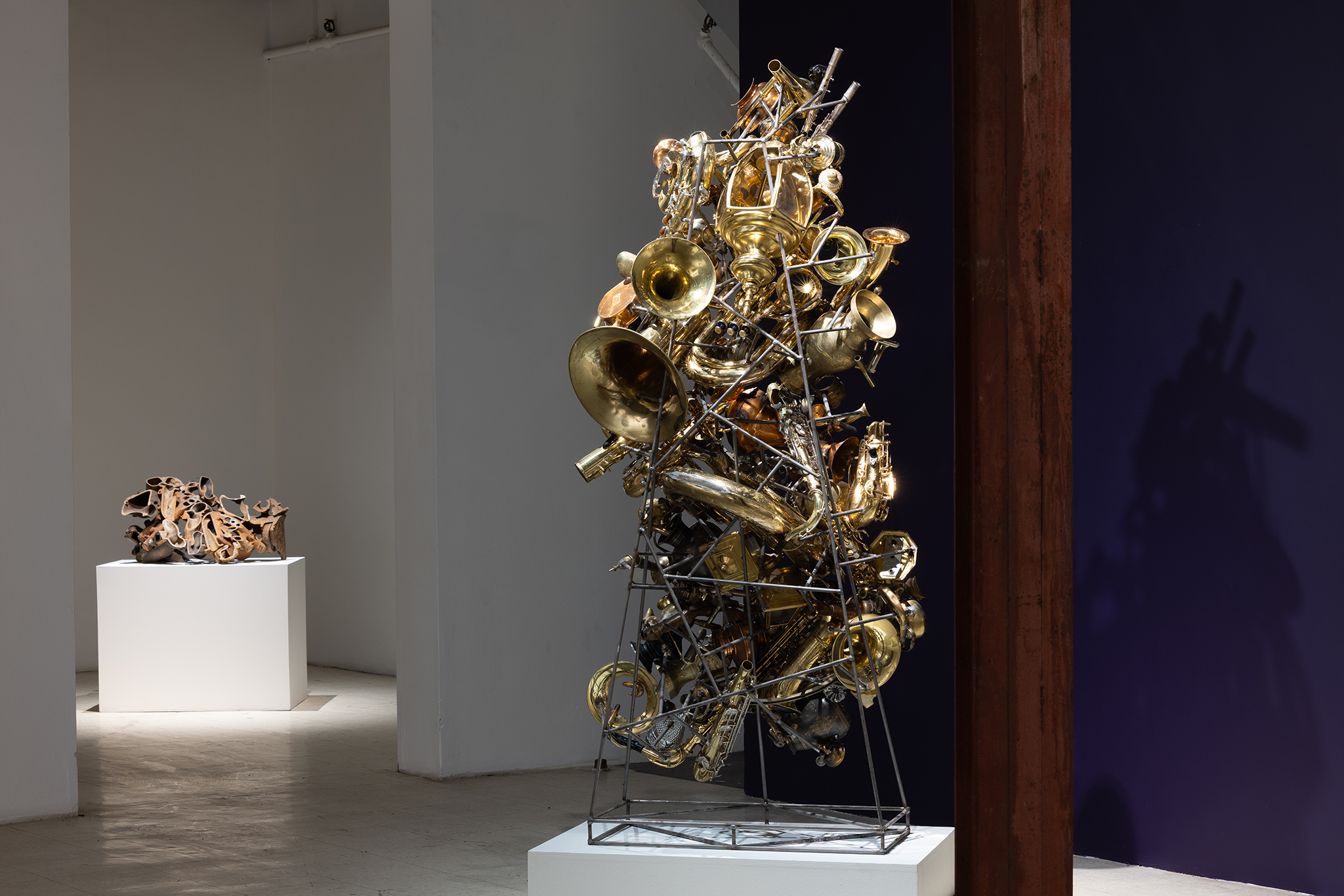 Les sculptures présentées dans l’exposition sont constituées d’éléments variés – ossements, coquillages, verre, céramique et de nombreux autres matériaux récupérés – découpés de manière à en révéler la structure interne. Dans l’œuvre Cross Section I (2024), soutenue par des armatures d’acier, les fragments semblent flotter dans l’espace, maintenus dans une tension constante entre stabilité et précarité. Le regard circule alors entre les surfaces mises à nu, les vides et les structures de soutien, révélant un intérêt pour ce qui relie les éléments autant que pour ce qui les compose.