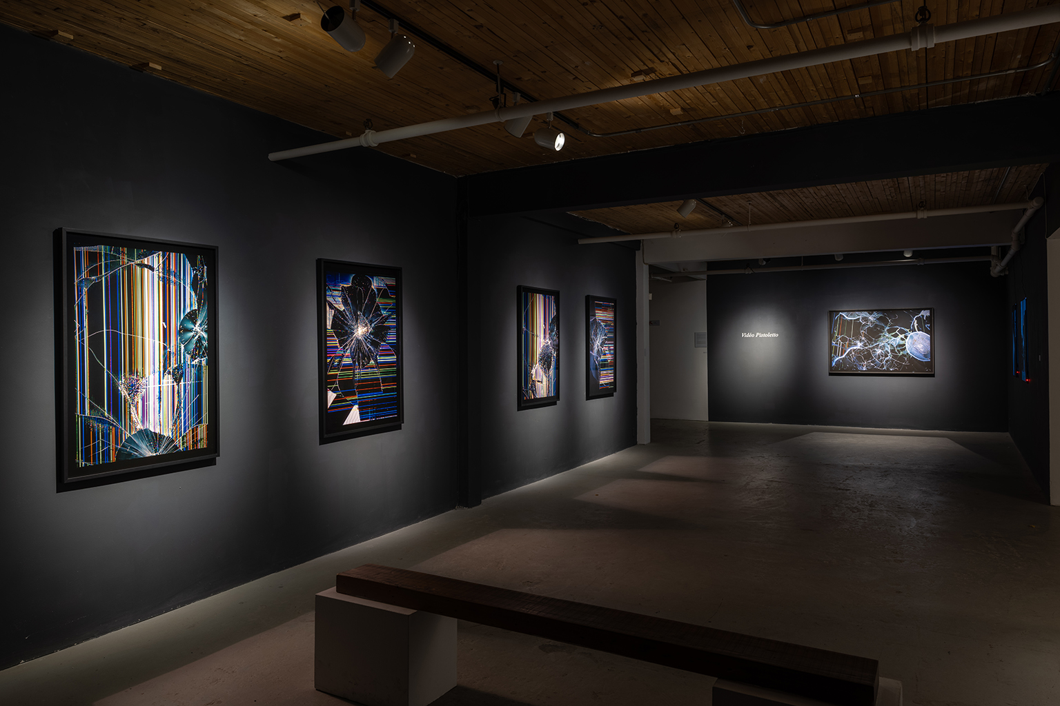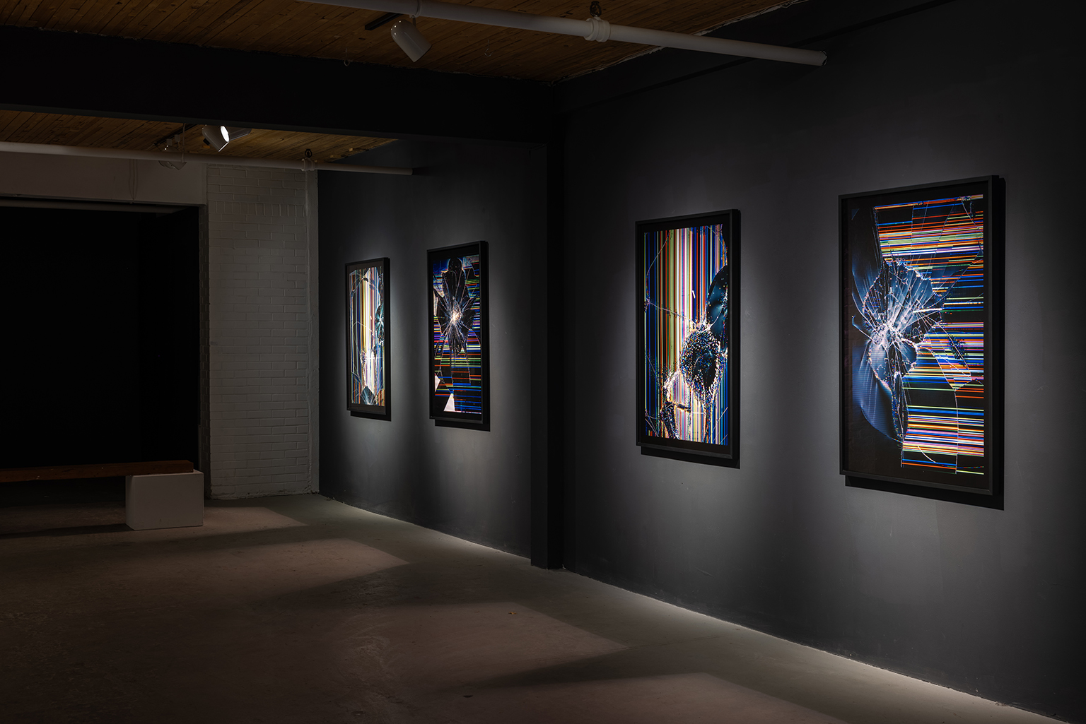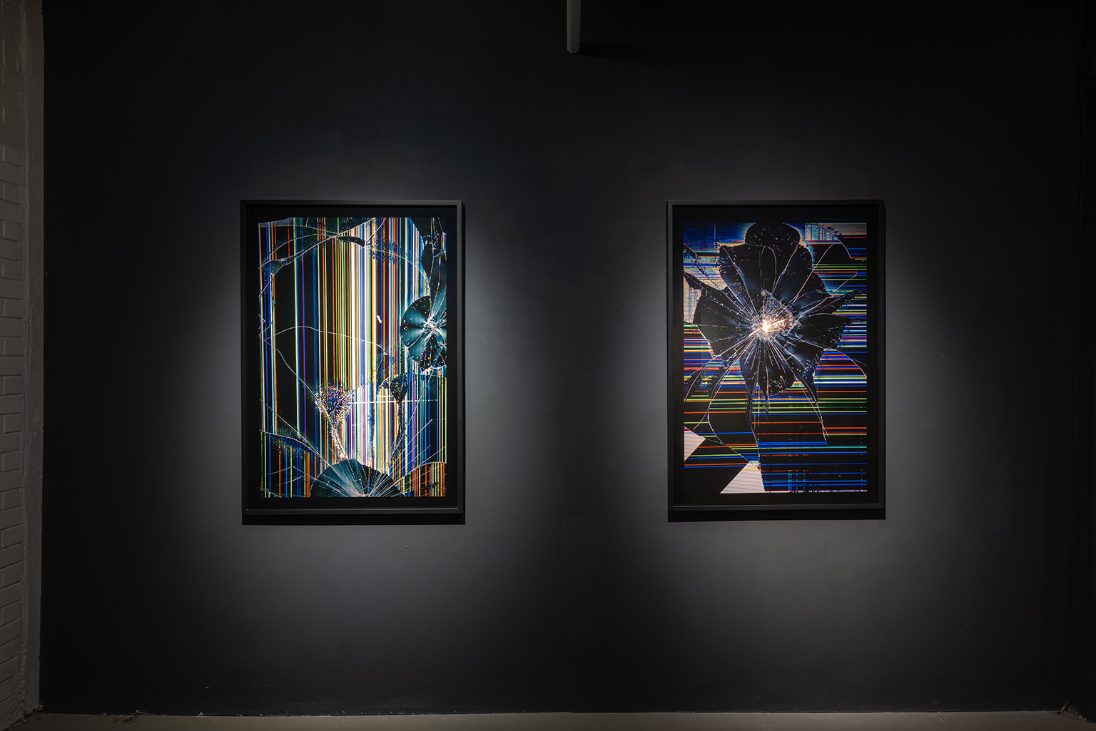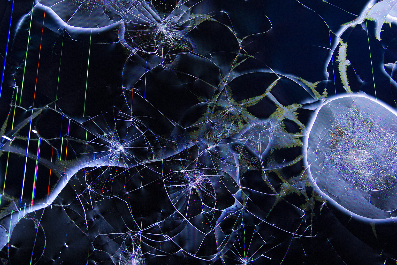 Réalisée entre 2014 et 2018, la série Vidéo Pistoletto explore la rencontre entre performance et matériau technologique à travers une réinterprétation contemporaine des actions de Michelangelo Pistoletto, figure centrale du mouvement de l’Arte Povera. Là où Pistoletto brisait des miroirs, Oli Sorenson s’empare ici d’écrans vidéo à cristaux liquides (LCD) qu’il fracture à l’aide d’un marteau et d’un burin. Les fragments de cristaux, qui continuent partiellement de réagir au signal vidéo, donnent naissance à des compositions organiques où les pixels dispersés dialoguent avec l’image numérique. Ainsi, les éclats de verre deviennent autant d’éléments sculpturaux, oscillant entre abstraction et mémoire de la représentation.