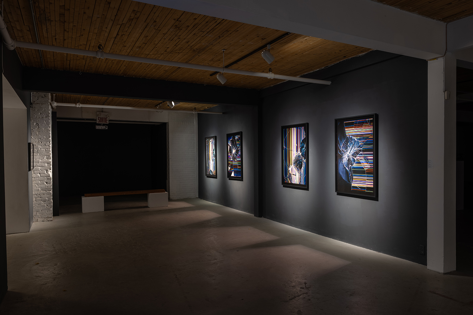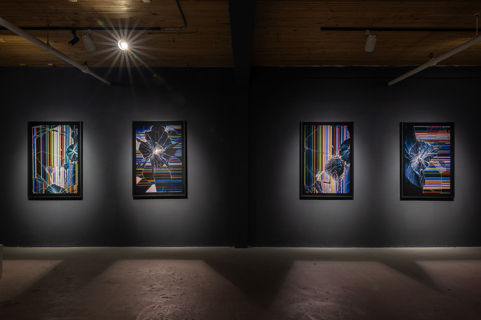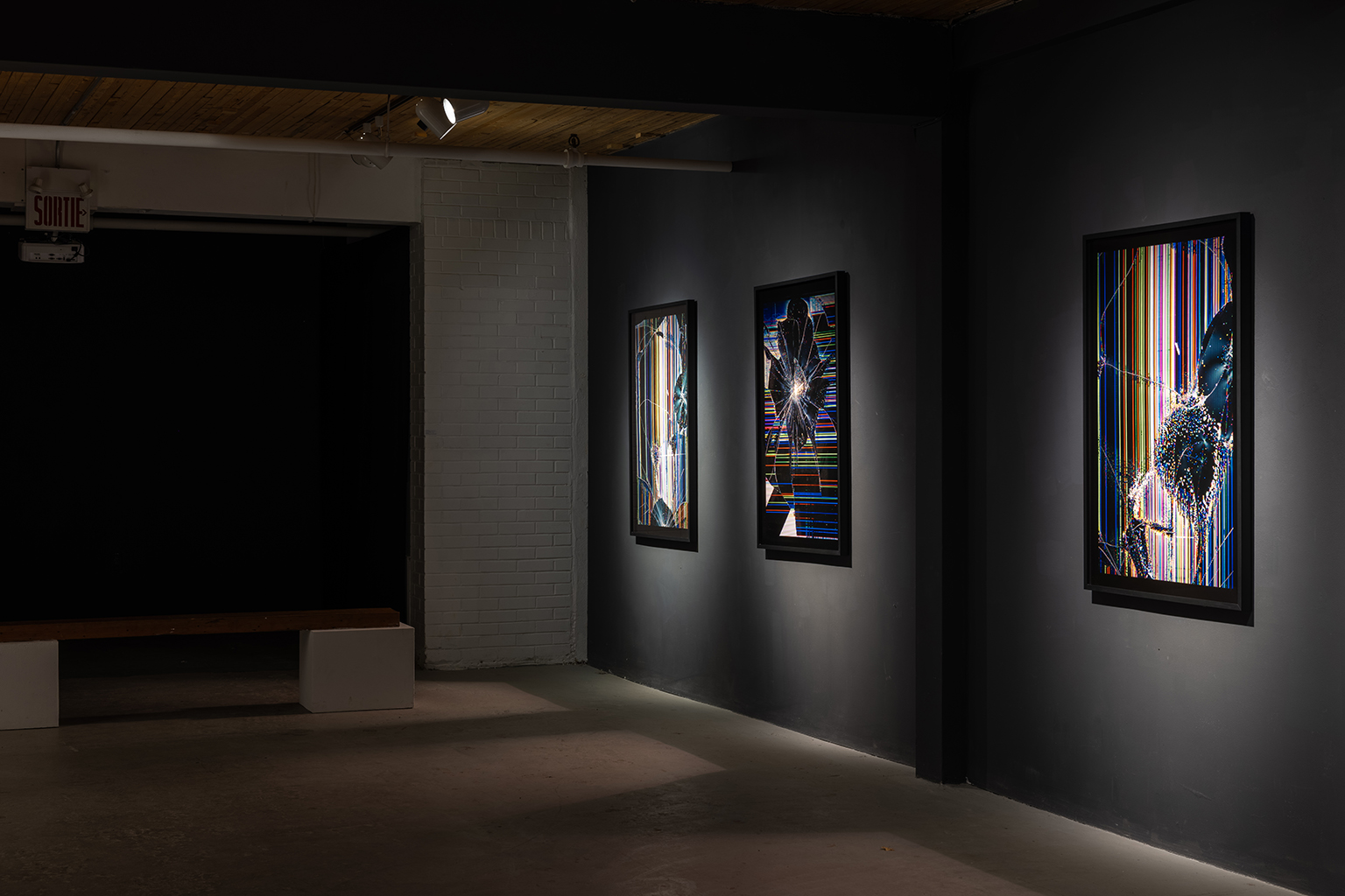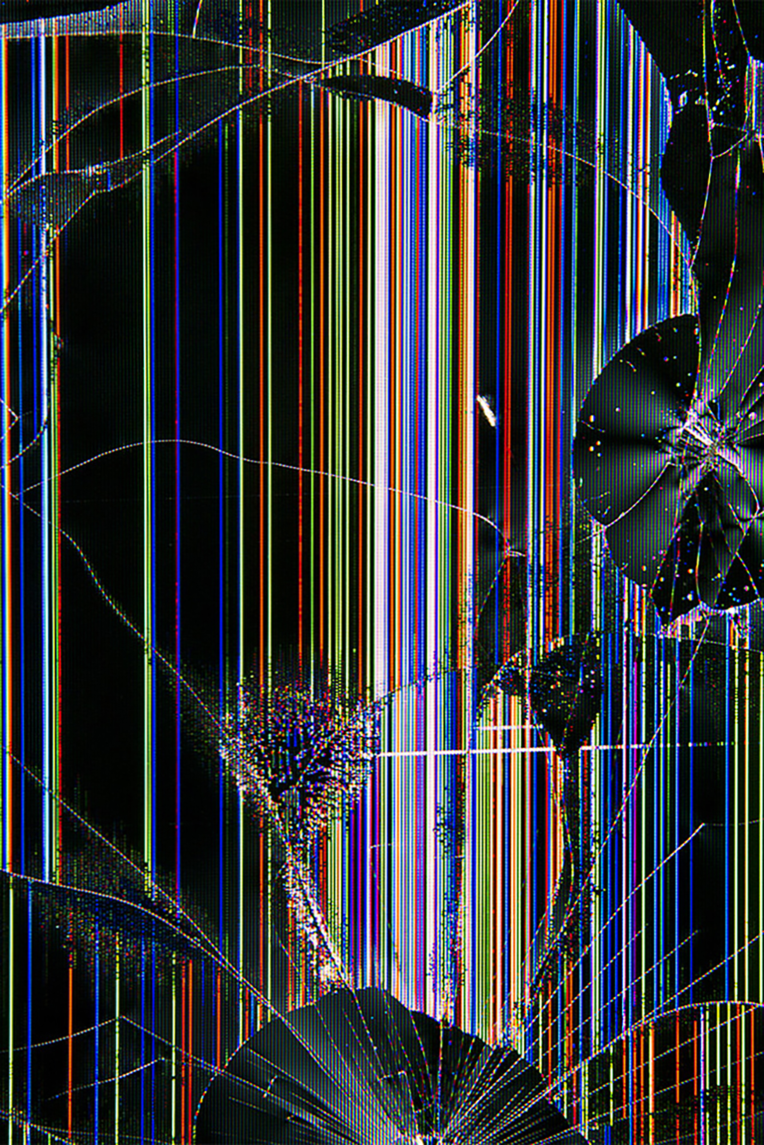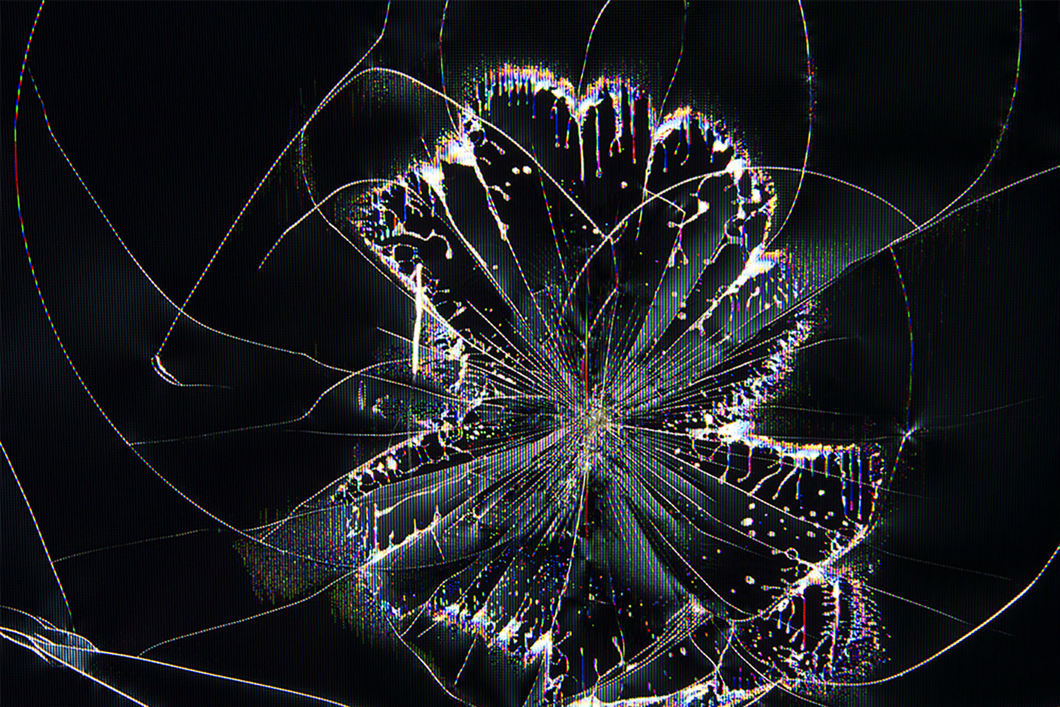 Réalisée entre 2014 et 2018, la série Vidéo Pistoletto explore la rencontre entre performance et matériau technologique à travers une réinterprétation contemporaine des actions de Michelangelo Pistoletto, figure centrale du mouvement de l’Arte Povera. Là où Pistoletto brisait des miroirs, Oli Sorenson s’empare ici d’écrans vidéo à cristaux liquides (LCD) qu’il fracture à l’aide d’un marteau et d’un burin. Les fragments de cristaux, qui continuent partiellement de réagir au signal vidéo, donnent naissance à des compositions organiques où les pixels dispersés dialoguent avec l’image numérique. Ainsi, les éclats de verre deviennent autant d’éléments sculpturaux, oscillant entre abstraction et mémoire de la représentation.