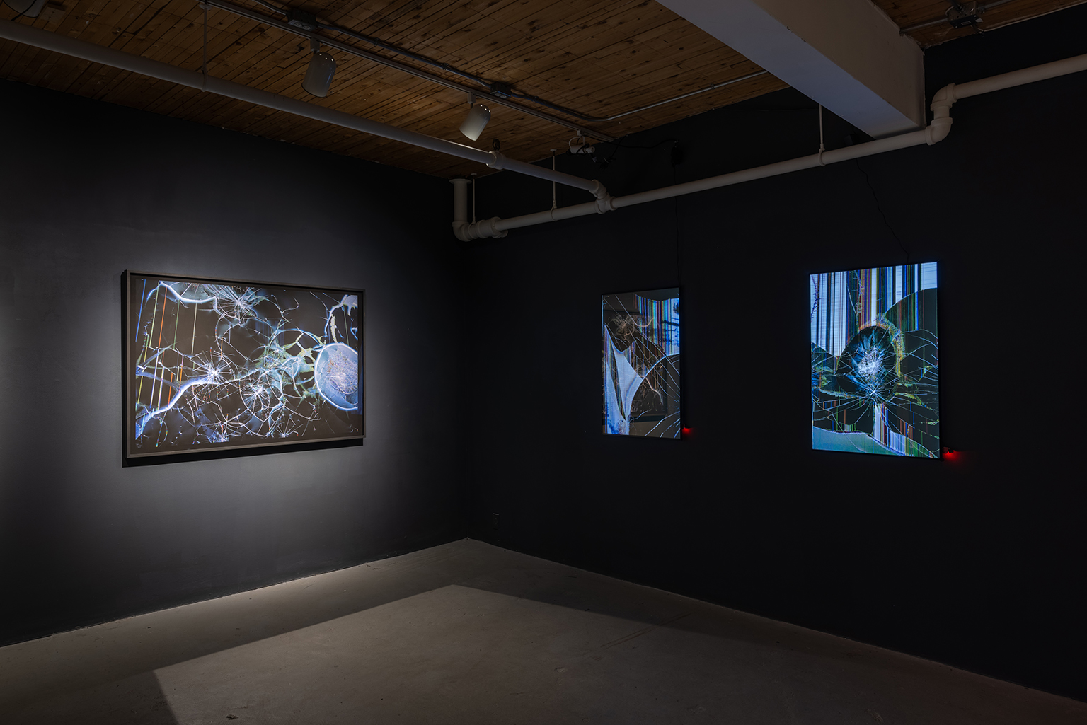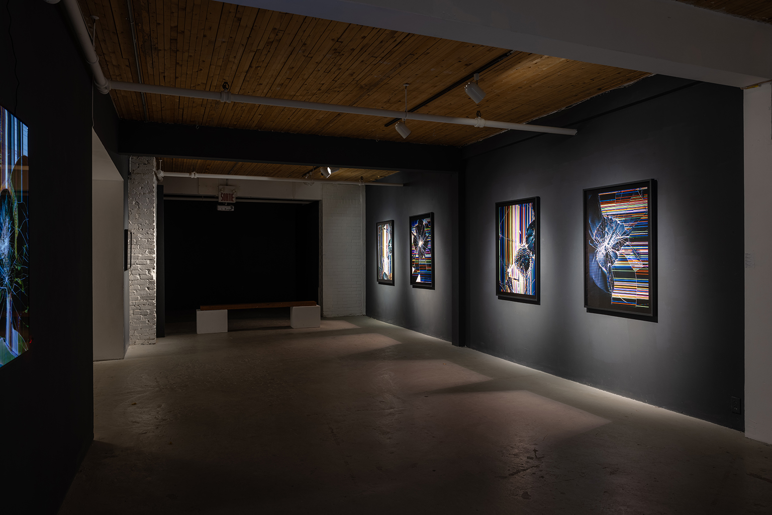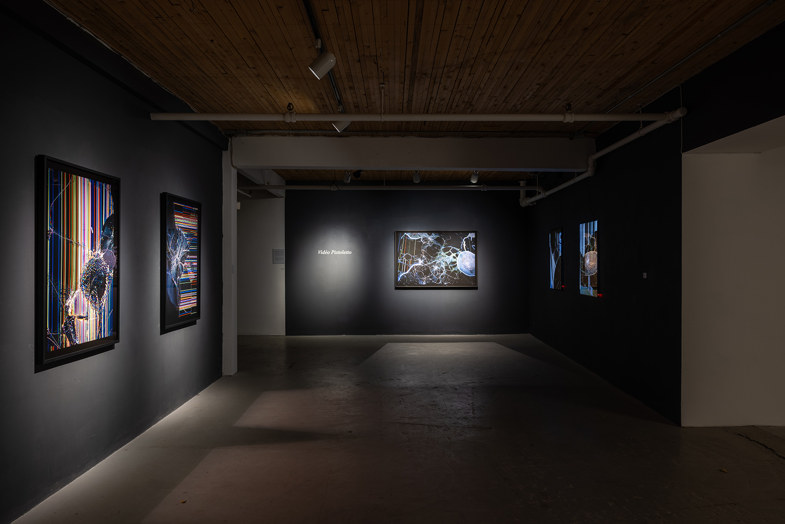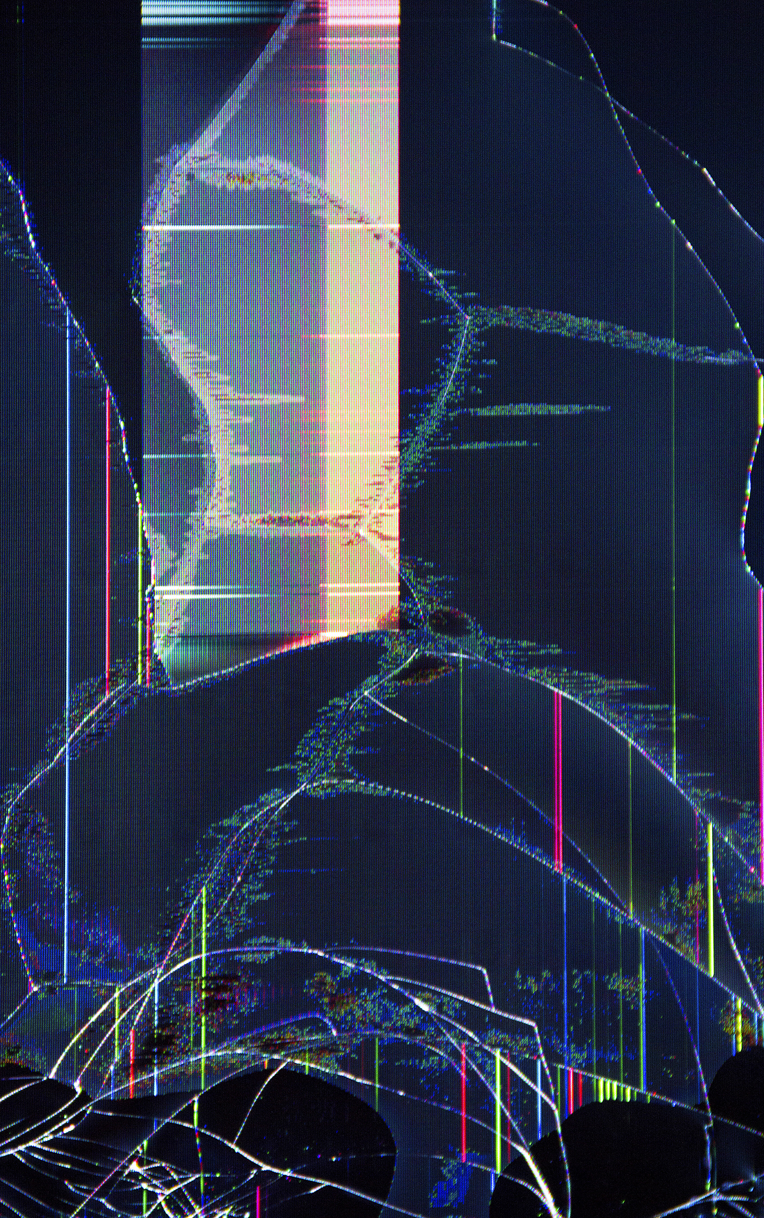 Réalisée entre 2014 et 2018, la série Vidéo Pistoletto explore la rencontre entre performance et matériau technologique à travers une réinterprétation contemporaine des actions de Michelangelo Pistoletto, figure centrale du mouvement de l’Arte Povera. Là où Pistoletto brisait des miroirs, Oli Sorenson s’empare ici d’écrans vidéo à cristaux liquides (LCD) qu’il fracture à l’aide d’un marteau et d’un burin. Les fragments de cristaux, qui continuent partiellement de réagir au signal vidéo, donnent naissance à des compositions organiques où les pixels dispersés dialoguent avec l’image numérique. Ainsi, les éclats de verre deviennent autant d’éléments sculpturaux, oscillant entre abstraction et mémoire de la représentation.