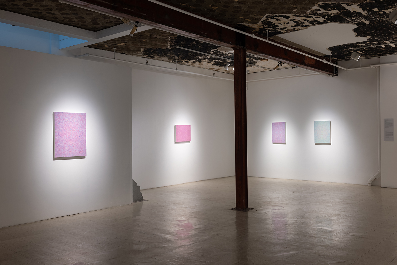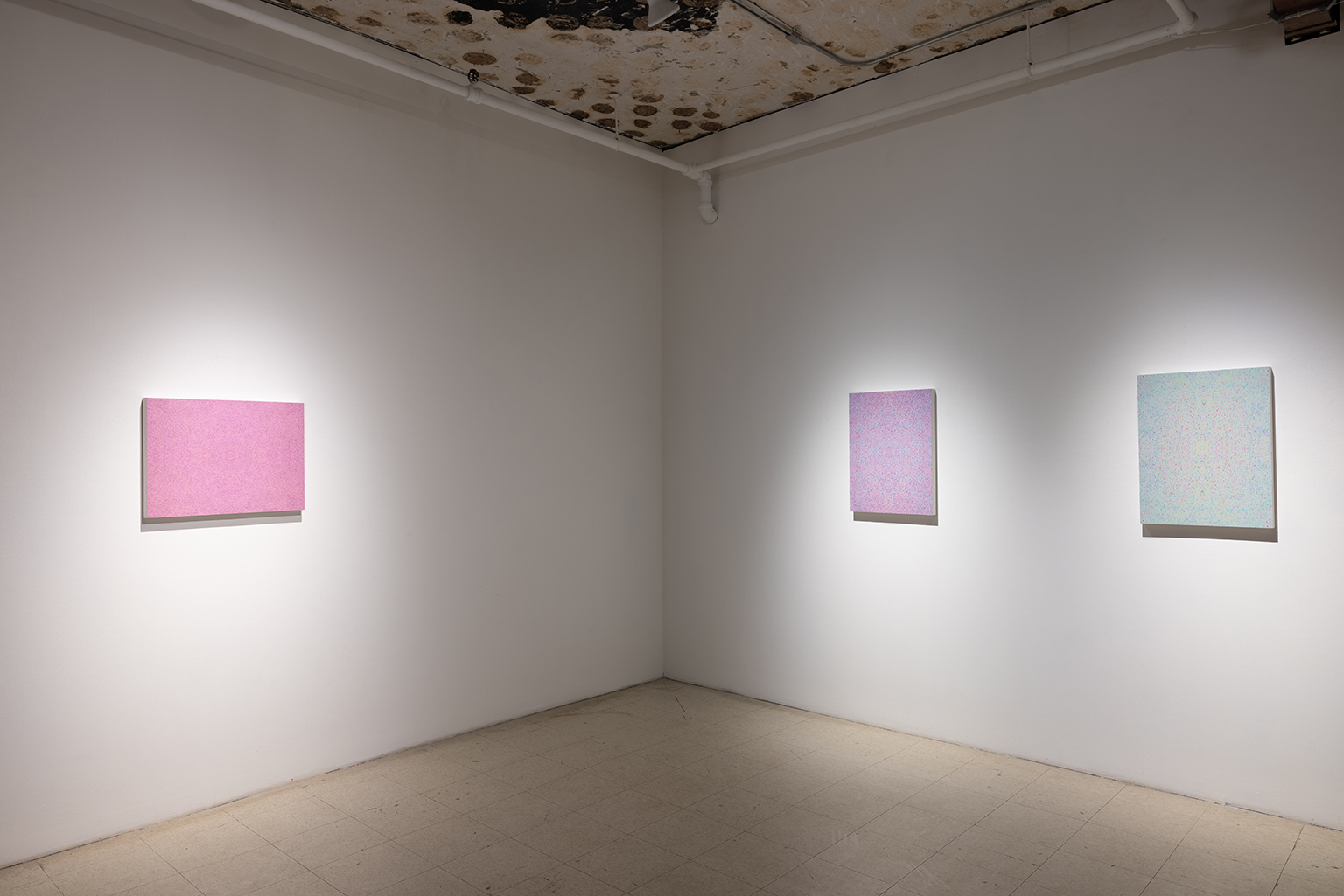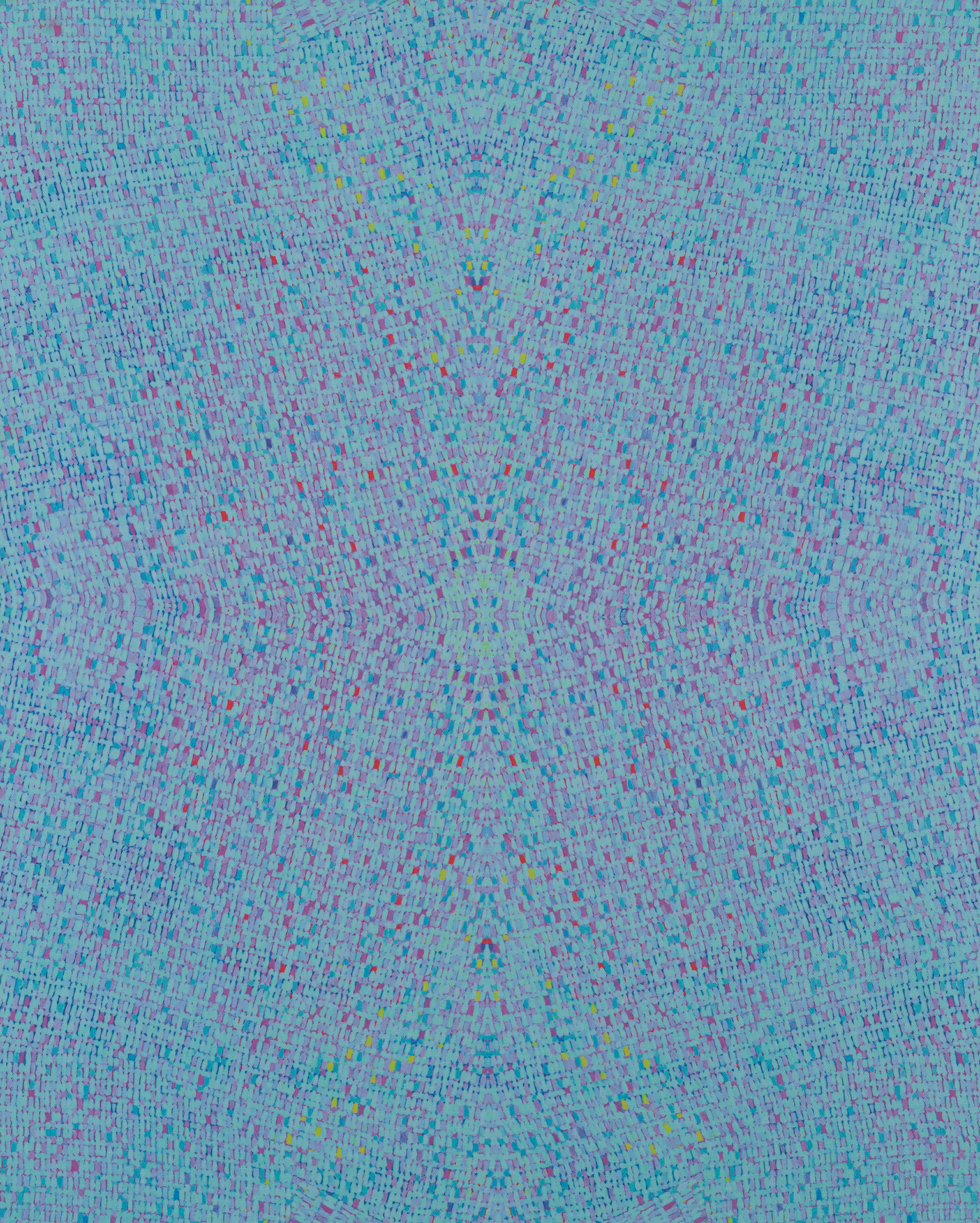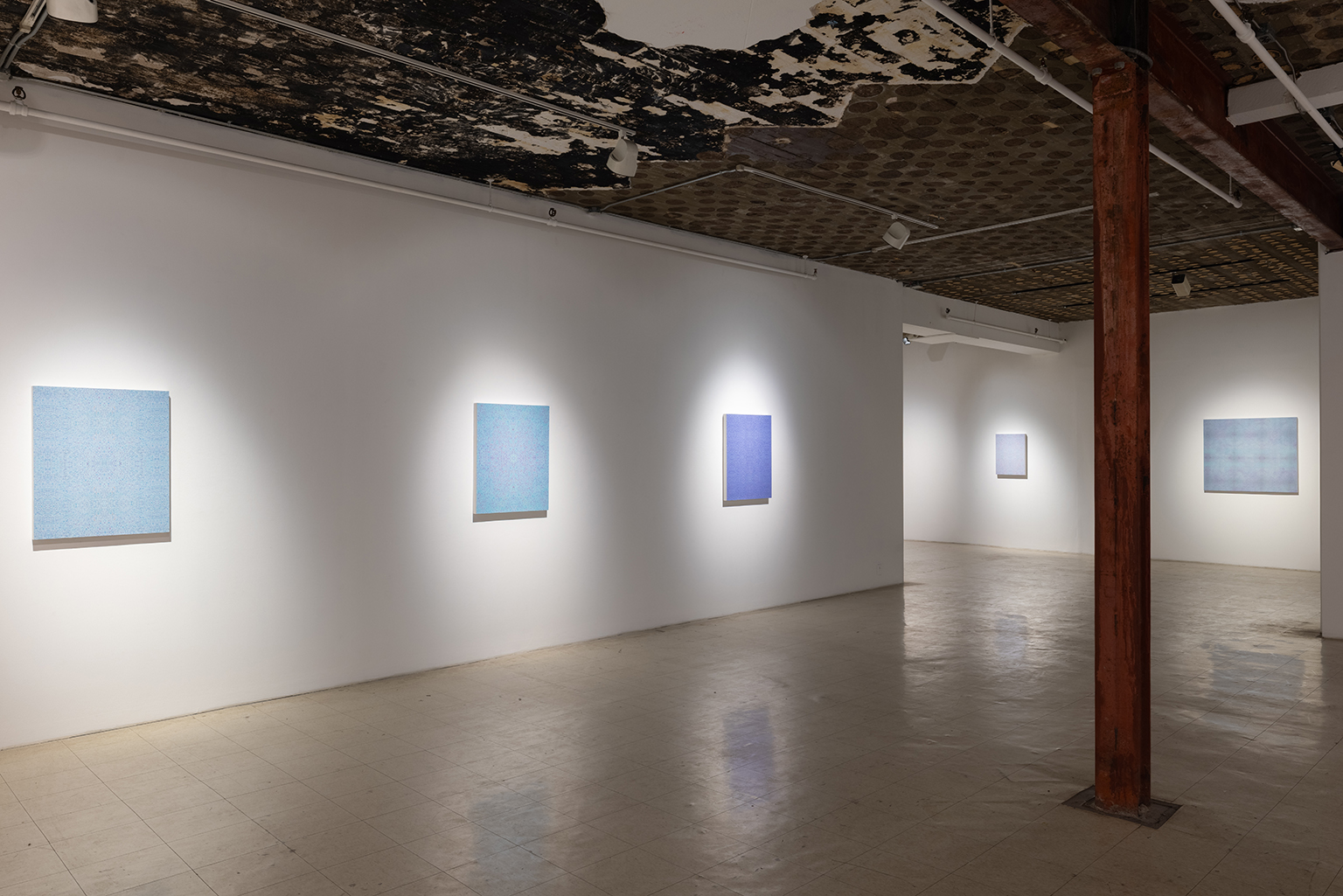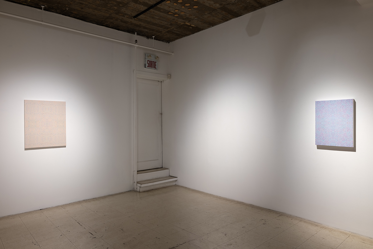 Across the eleven works in this exhibition, translucent washes of colour diffuse light, forming veils that shift Nobel’s imagery in perceived scale and depth. Up close, each piece reveals intricate networks of mark-making, visual intervals that ripple across the progression of paintings. Denser pigments add gravity and contrast, while dynamic pointillism vibrates on the linen surfaces. From a distance, details coalesce around a subtle focal point, hinting at a gravitational centre within a celestial field. This tension between symmetry, micro-detail and vastness invites a hypnotic mode of looking, one where sustained attention transforms surfaces into space and alludes to frenetic energy bouncing between the series.