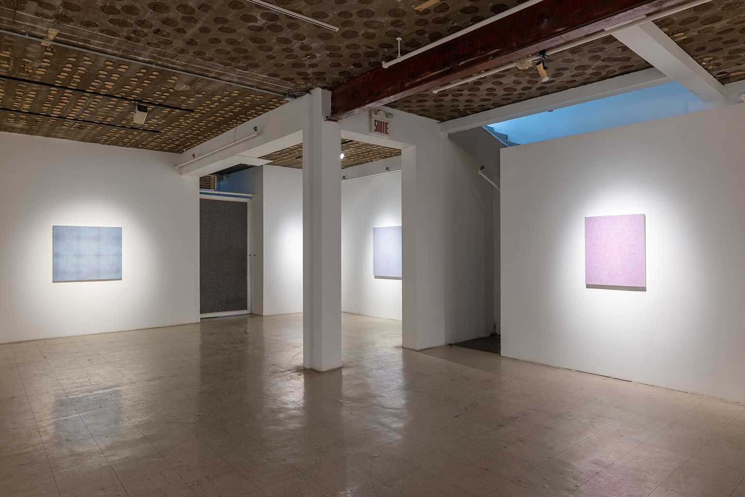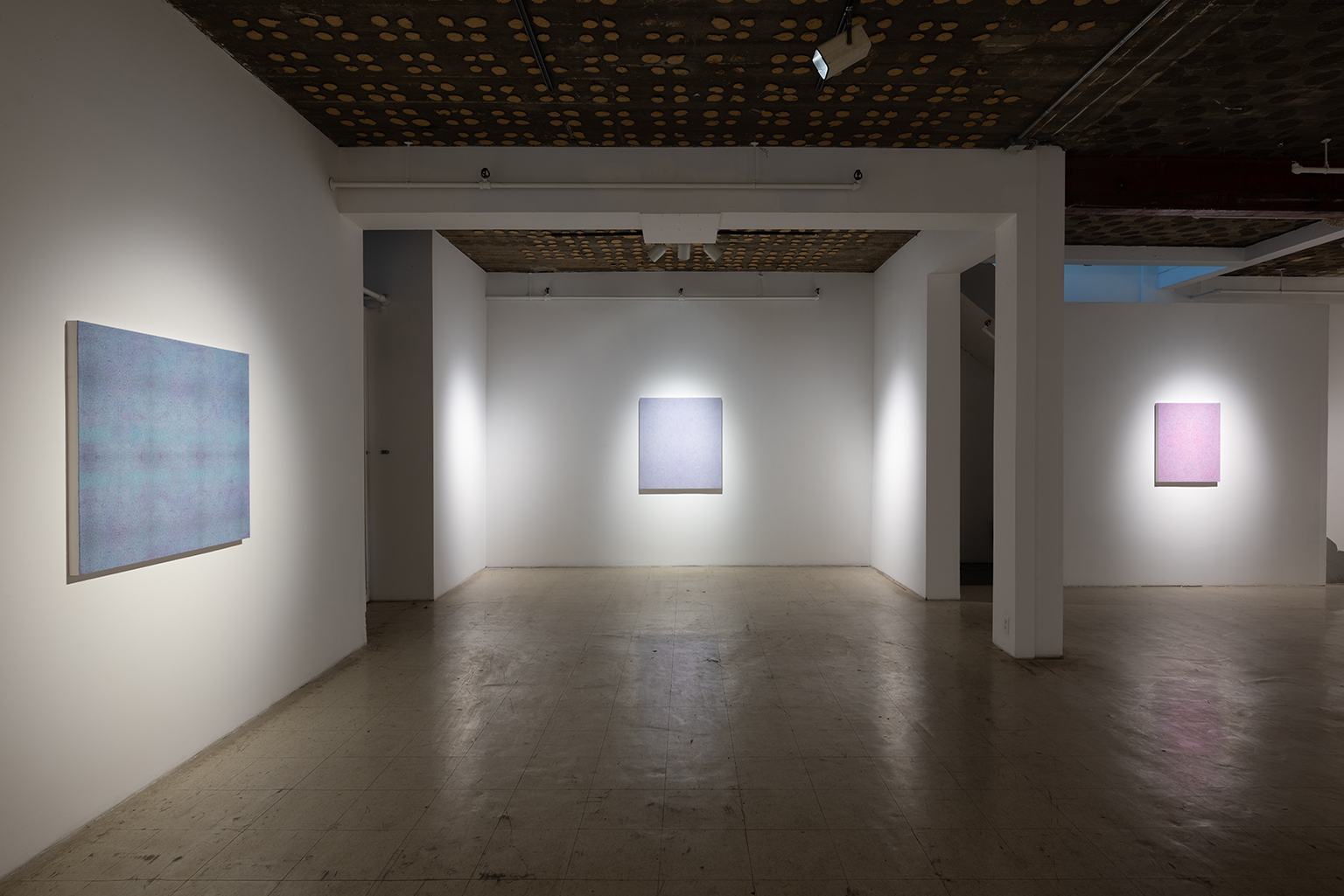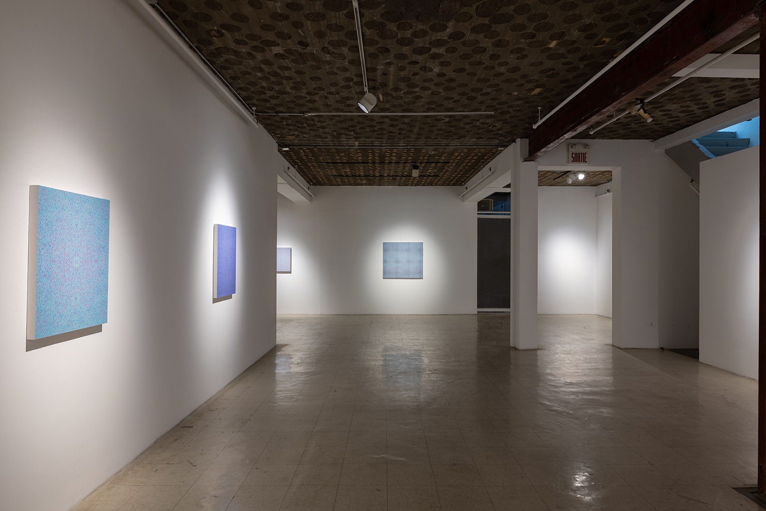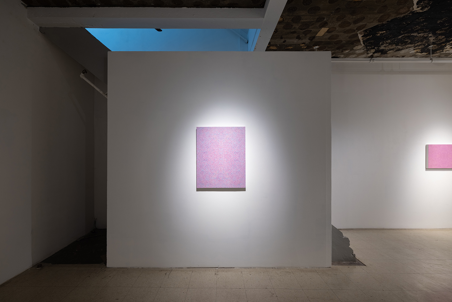 Across the eleven works in this exhibition, translucent washes of colour diffuse light, forming veils that shift Nobel’s imagery in perceived scale and depth. Up close, each piece reveals intricate networks of mark-making, visual intervals that ripple across the progression of paintings. Denser pigments add gravity and contrast, while dynamic pointillism vibrates on the linen surfaces. From a distance, details coalesce around a subtle focal point, hinting at a gravitational centre within a celestial field. This tension between symmetry, micro-detail and vastness invites a hypnotic mode of looking, one where sustained attention transforms surfaces into space and alludes to frenetic energy bouncing between the series.
