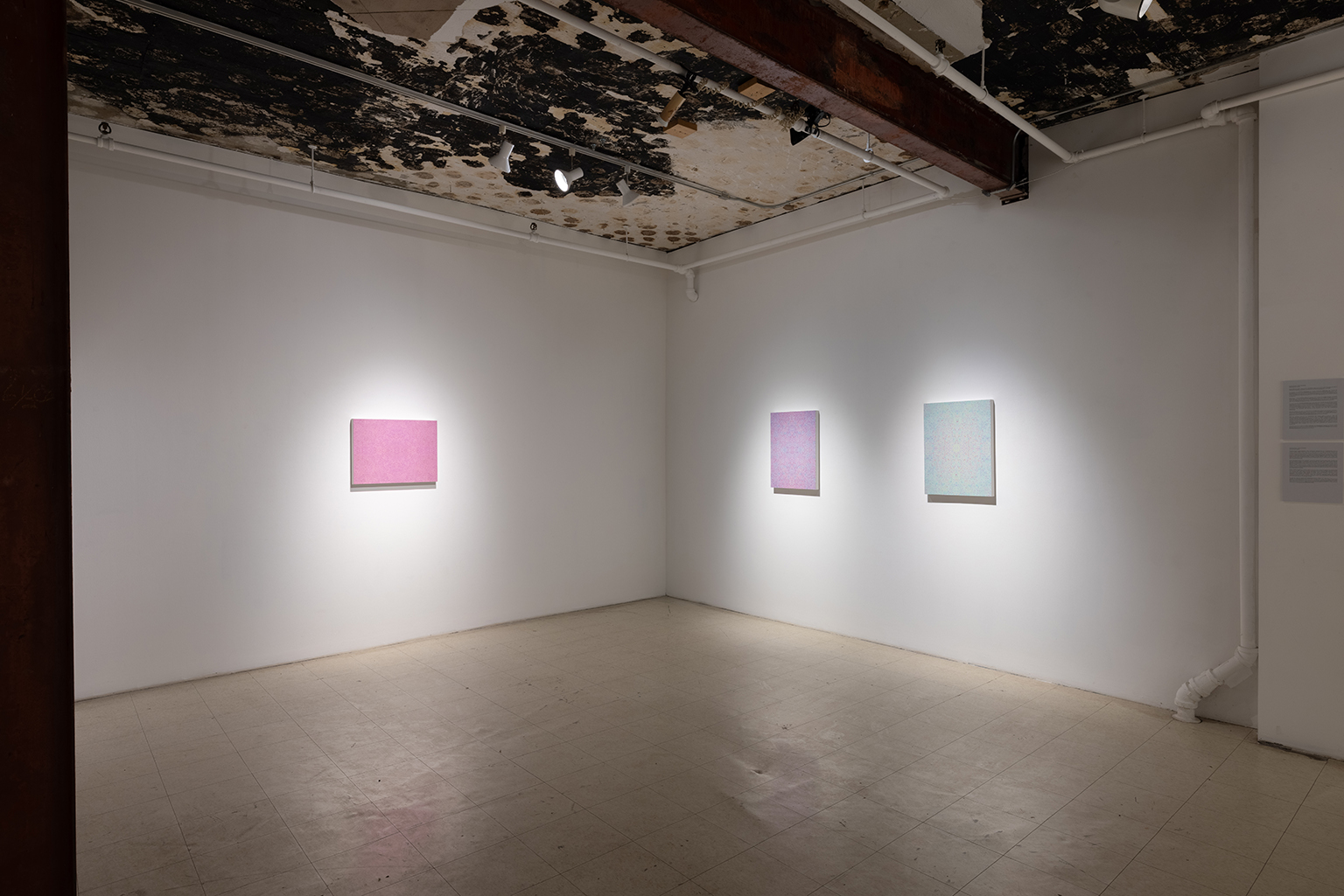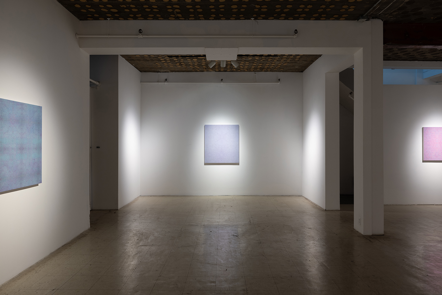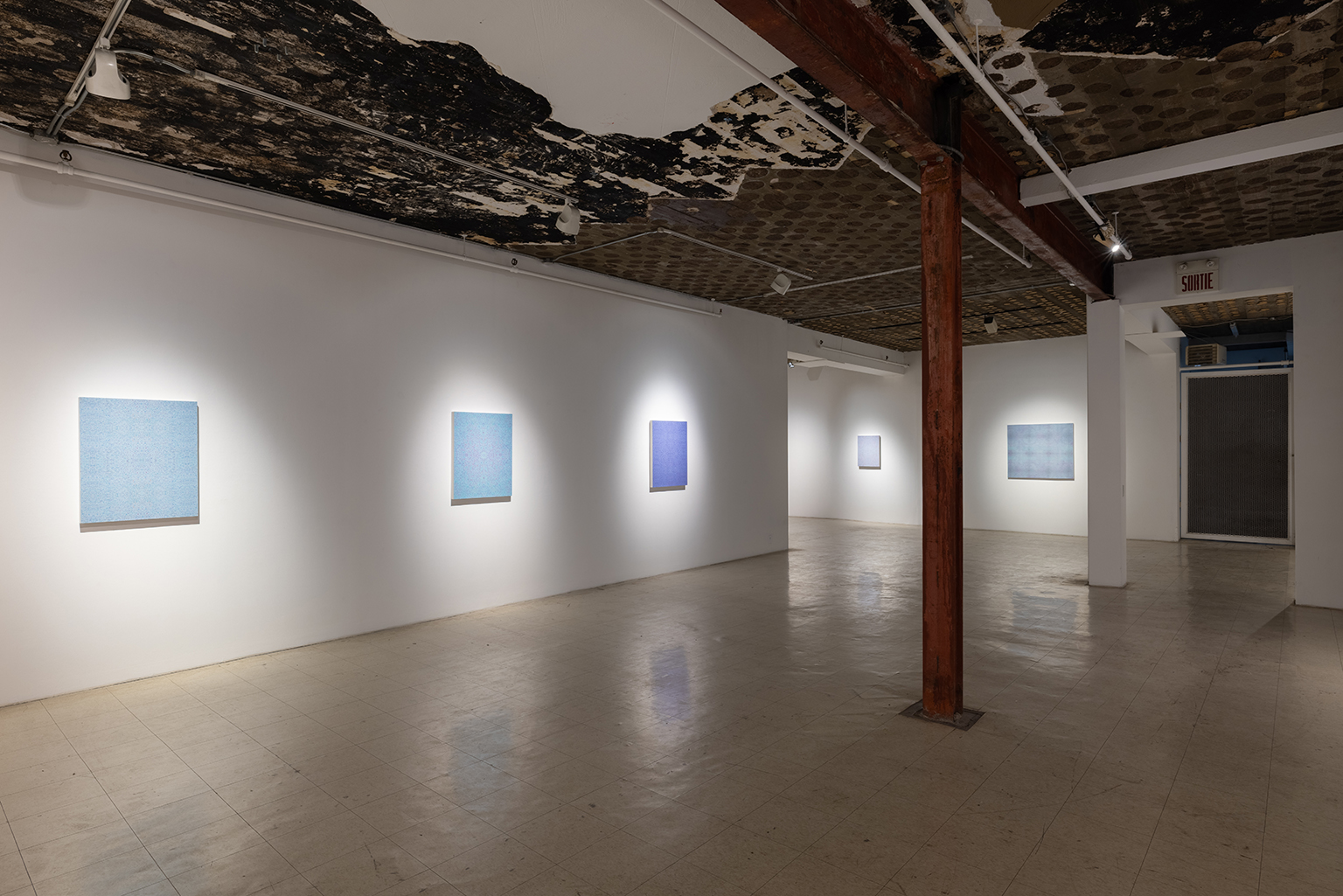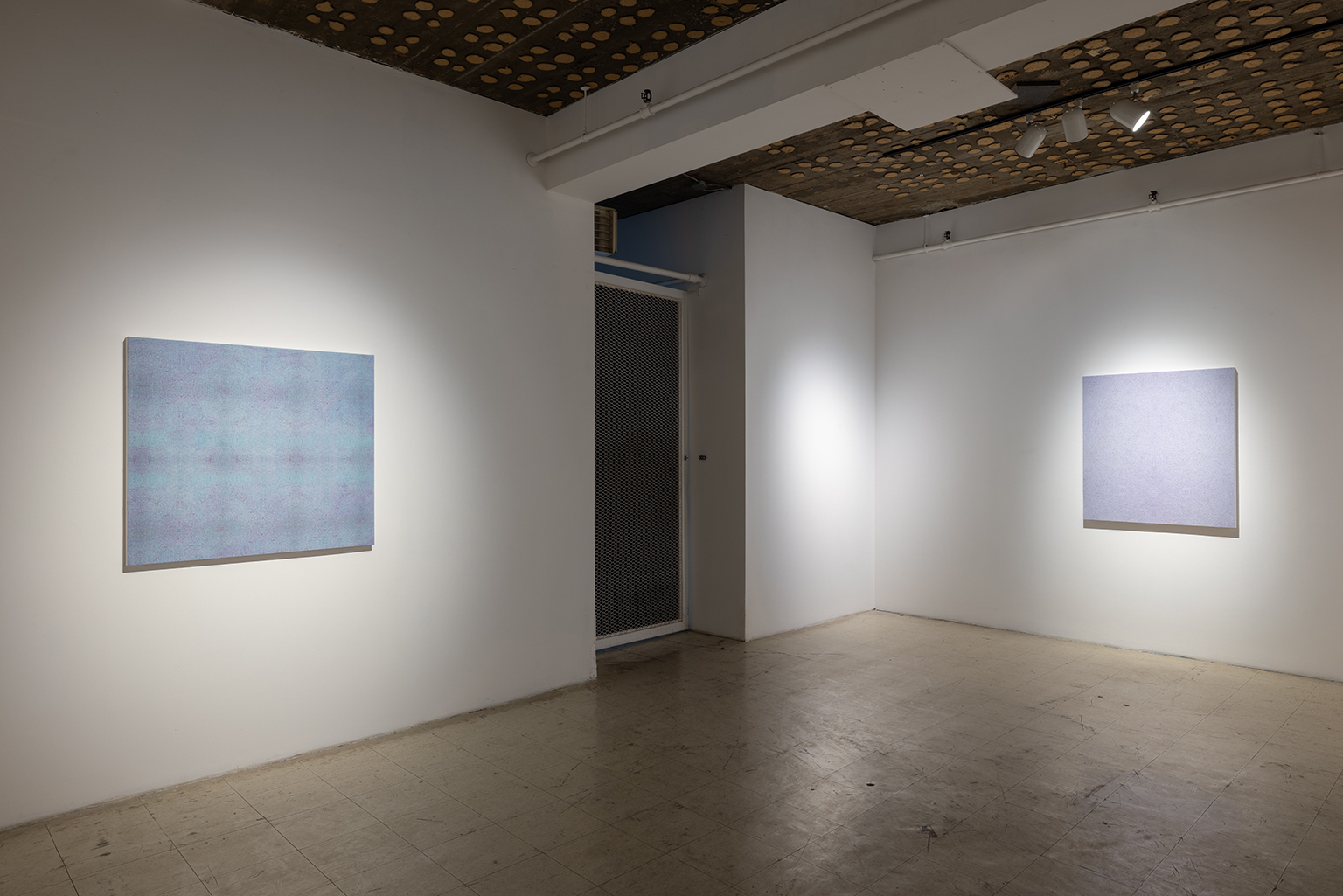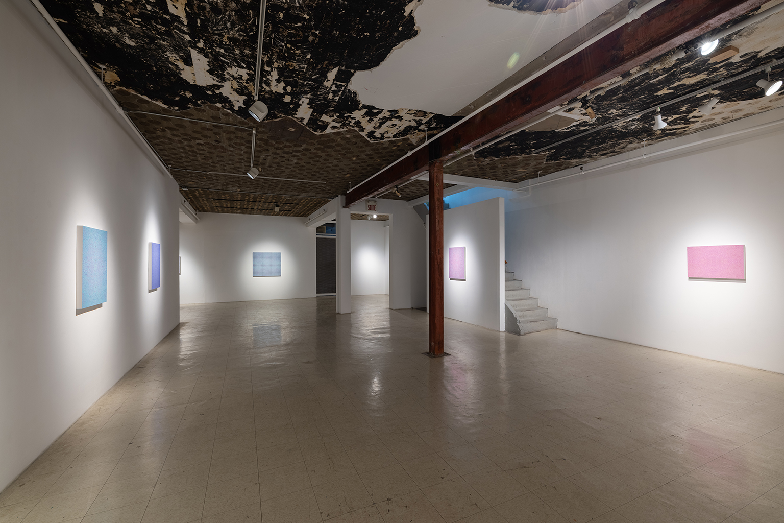 Across the eleven works in this exhibition, translucent washes of colour diffuse light, forming veils that shift Nobel’s imagery in perceived scale and depth. Up close, each piece reveals intricate networks of mark-making, visual intervals that ripple across the progression of paintings. Denser pigments add gravity and contrast, while dynamic pointillism vibrates on the linen surfaces. From a distance, details coalesce around a subtle focal point, hinting at a gravitational centre within a celestial field. This tension between symmetry, micro-detail and vastness invites a hypnotic mode of looking, one where sustained attention transforms surfaces into space and alludes to frenetic energy bouncing between the series.