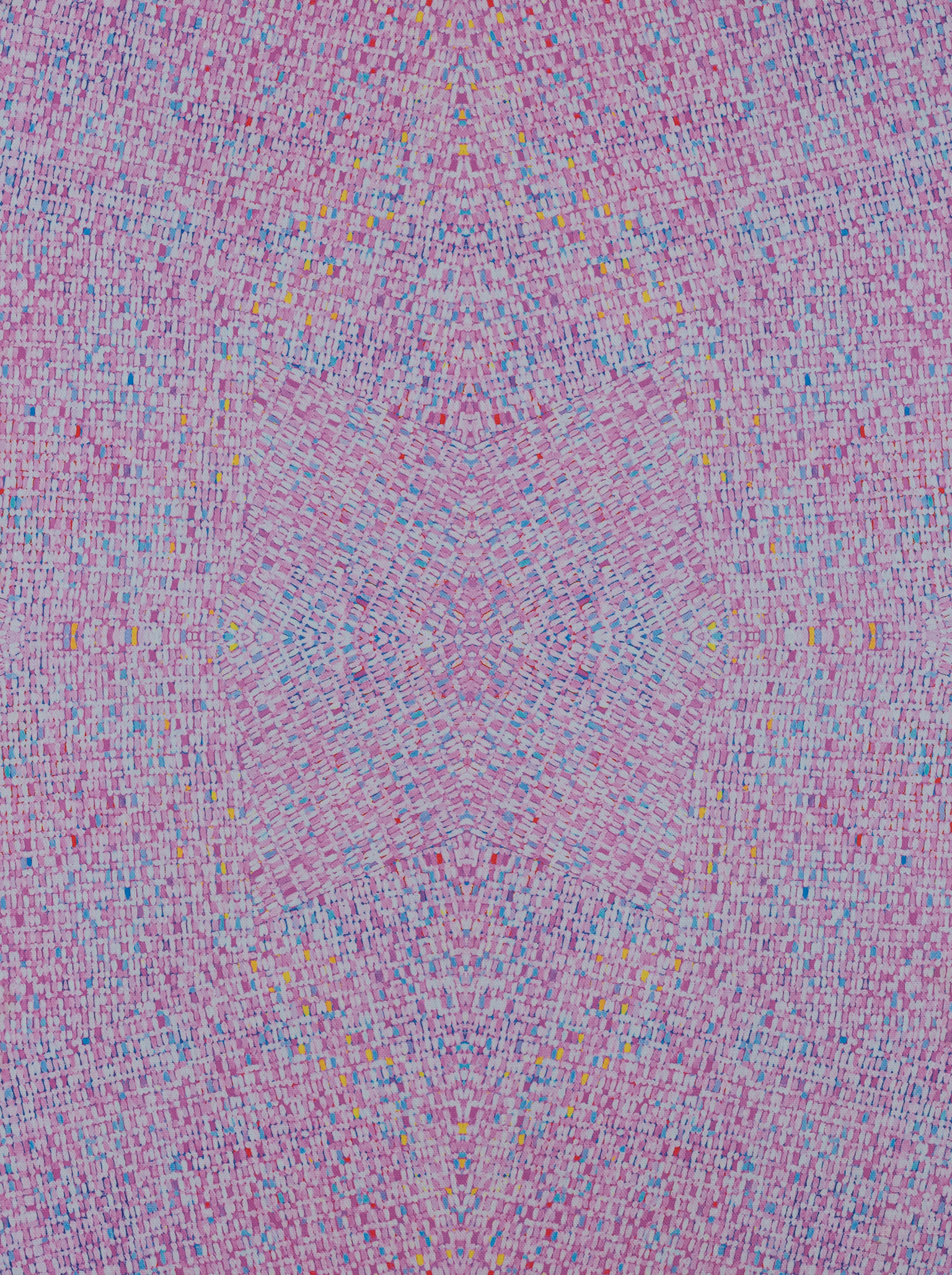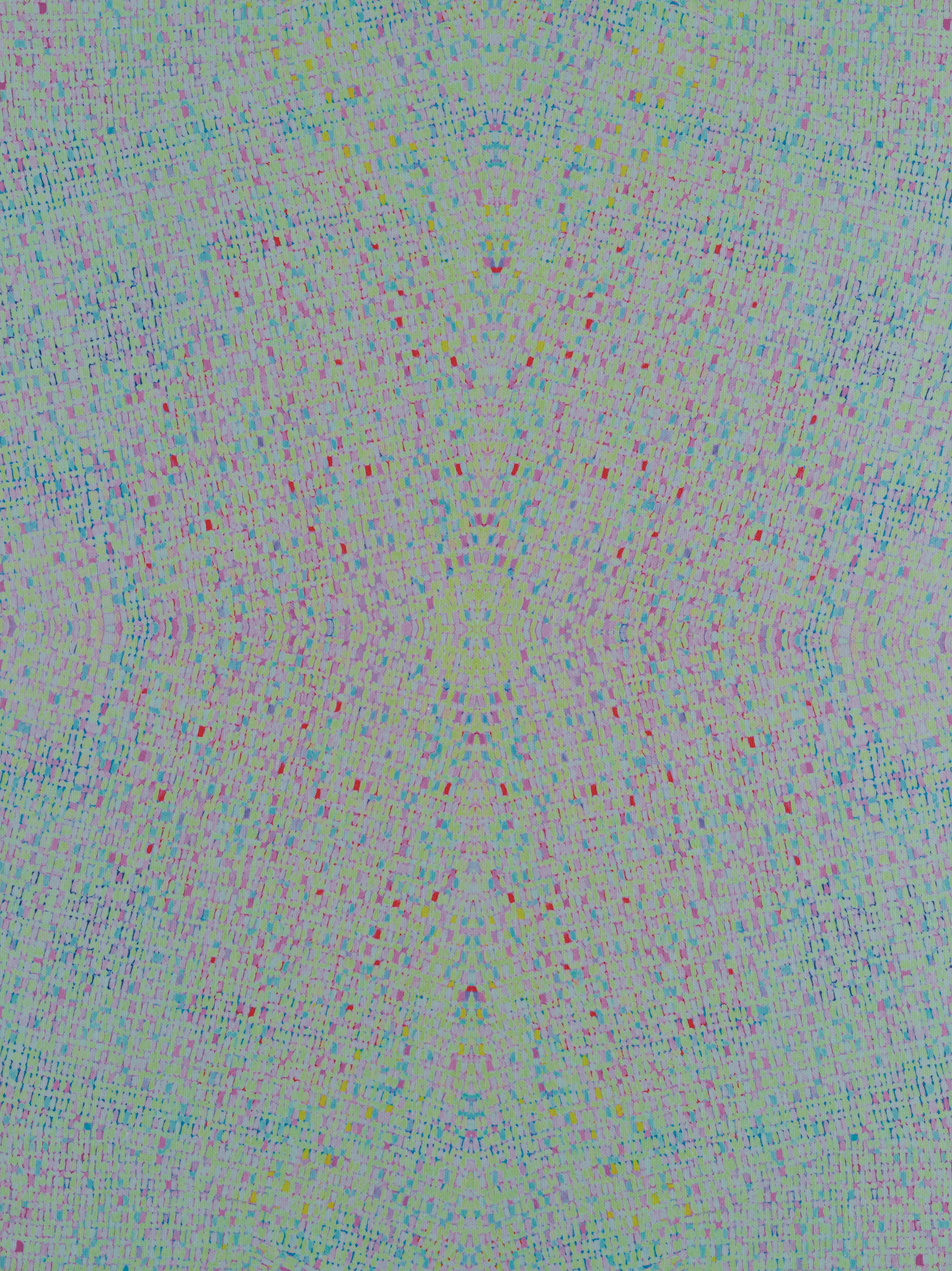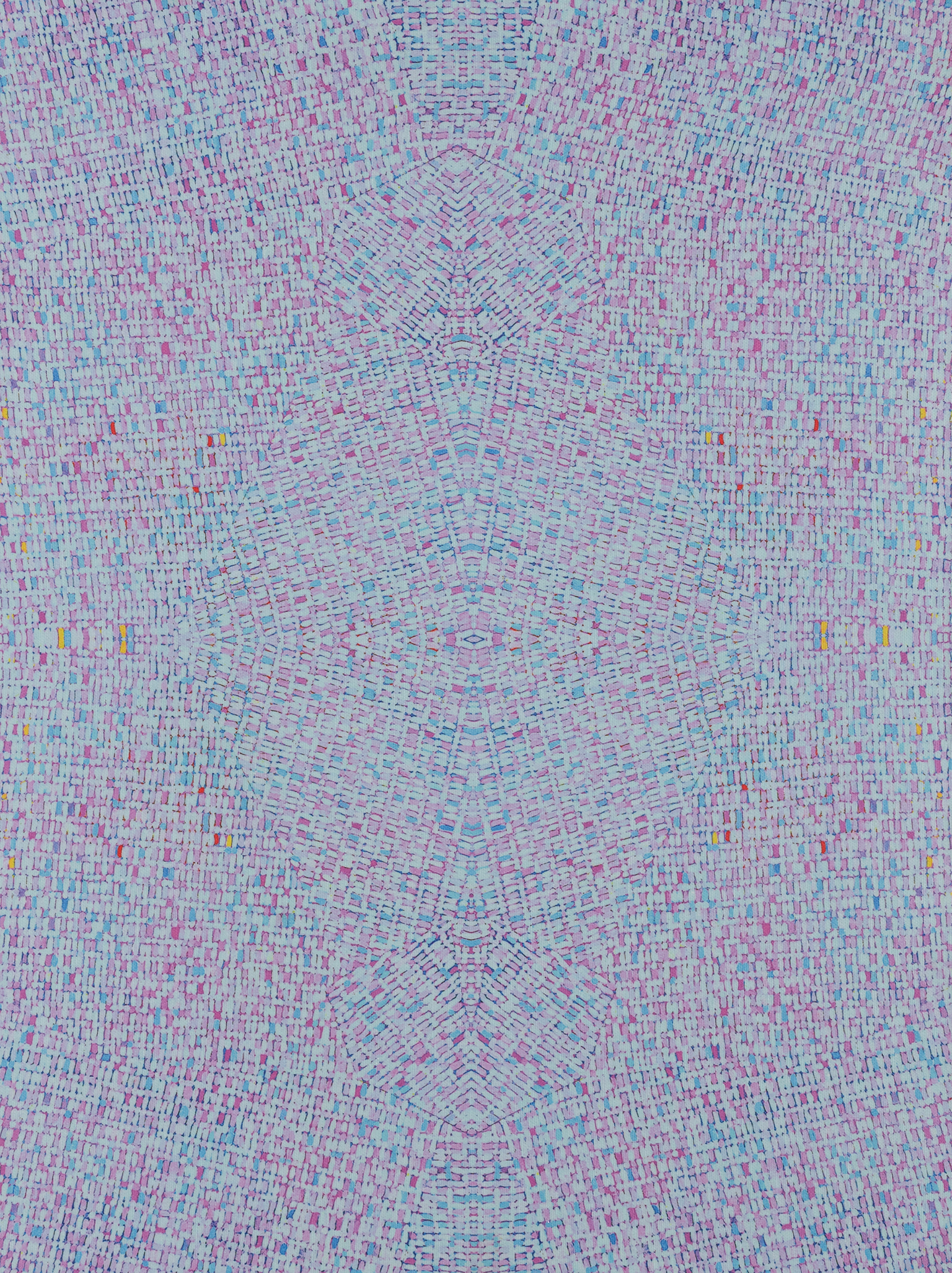Nobel’s patterning gestures towards organic symmetry that is found throughout the natural world and the cosmos alike. Drawing on Paul Klee’s conception of colour as “an organic whole in motion” (The Thinking Eye, 1961), Nobel extends this theory into a contemporary language of fluid abstraction. Her chromatic fields appear to breathe, generating movement and rhythm that resonates as both spatial and temporal. Within this movement, pigments behave like pulses, vibrating through fields of light and shadow, guiding the viewer’s eye along elliptical trajectories that echo planetary paths and the beating of a heart.